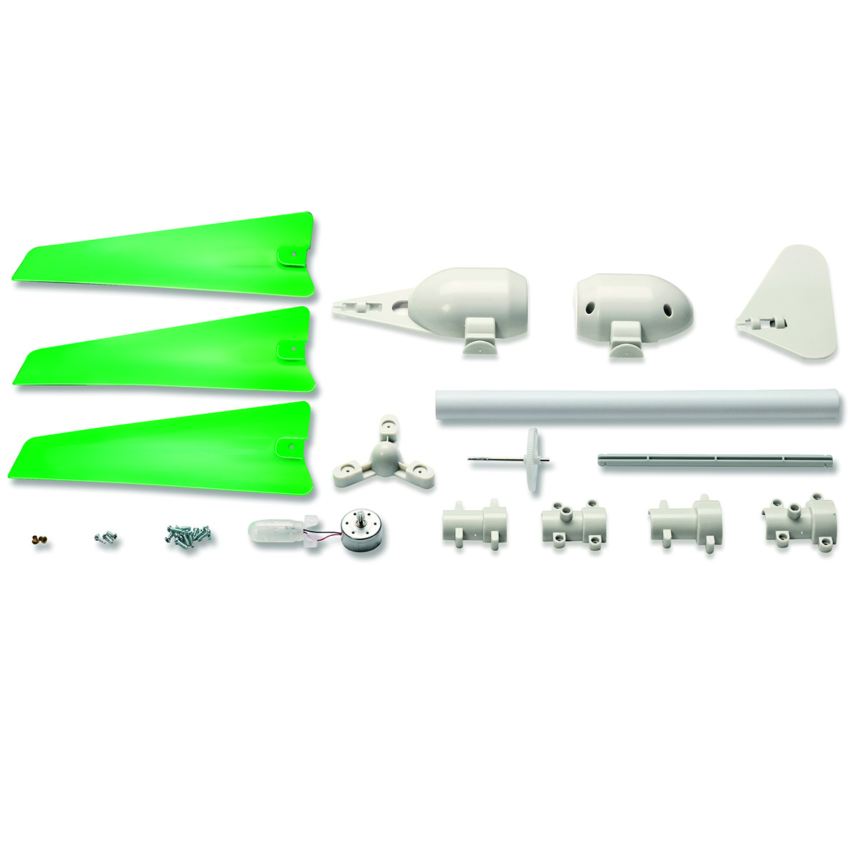 ΠΕΡΙΕΧΟΜΕΝΑ: Μέρος 1: Θάλαμος Χ 1, Μέρος 2: Κάλυμμα θαλάμου Χ 1, Μέρος 3: Πτερύγιο Χ 3, Μέρος 4: Συναρμολογημένη γεννήτρια και LED Χ 1, Μέρος 5: Στήριγμα Χ 1, Μέρος 6: Βάση πύργου Χ 1, Μέρος 7: Ουρά πτερυγίου Χ 1, Μέρος 8: Κεντρικός άξονας με στροφείο Χ 1, Μέρος 9: Οδοντωτός τροχός πάνω σε άξονα Χ 1, Μέρος 10: Κεραία ουράς Χ 1, Μέρος 11: