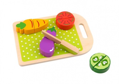 Τα ξύλινα σφηνώματα λαχανικών βοηθούν το παιδί να εξοικειωθεί με τα λαχανικά, τα σχήματα και τα χρώματα. Χρησιμοποιώντας ένα ξύλο κοπής και ένα ξύλινο μαχαιράκι, μπορεί εύκολα και γρήγορα να κόψει τα λαχανικά μαθαίνοντας την έννοια του μισού και του ολόκληρου. Συμπεριλαμβάνεται το ξύλο κοπής, το ξύλινο μαχαιράκι κι ο δίσκος για την τοποθέτηση των λαχανικών. Κατάλληλο για παιδιά ηλικίας άνω των 12 μηνών.