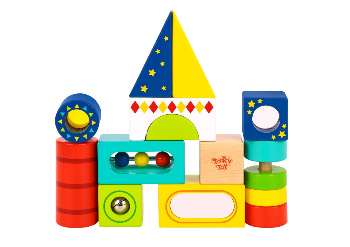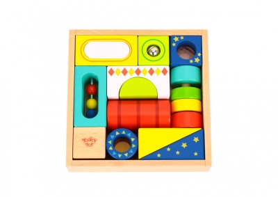 Αυτά τα ξύλινα τουβλάκια με διαφορετικούς σχεδιασμούς αποτελούμενα από καθρεφτάκια, σχήματα, κουδουνάκια κ.α. δίνουν απεριόριστες επιλογές δημιουργίας στο παιδί, αφήνοντάς το ελεύθερο να κατασκευάσει ό,τι θέλει με τη φαντασία του. Με αυτή την πληθώρα από χρωματιστά τουβλάκια που ποικίλουν σε σχήματα, το παιδί μαθαίνει τα σχήματα και τα μεγέθη και αποκτά καλύτερο συντονισμό ματιού και χεριού. Το παιχνίδι αποτελείται από 13 τεμάχια.