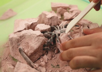 Κομμάτι γύψου με ανατριχιαστικά ζωύφια (αράχνη, σκορπιός, γεωσκώληκας, μυρμήγκια, μικρές αράχνες, σκουλήκια που λάμπουν στο σκοτάδι), εργαλείο ανασκαφής, πινέλο, μικρές και μεγάλες κάρτες δειγμάτων, ειδικές θήκες, μεγεθυντικός φακός και λεπτομερείς οδηγίες.