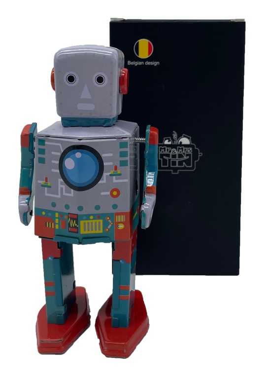 Ένα ιδιαίτερο χειροποίητο κουρδιστό μεταλλικό ρετρό ρομπότ εμπνευσμένο από τις δεκαετίες του ΄50 και του ΄60. Κατασκευασμένο από κασσίτερο, είναι χειροποίητο και αποτελείται από πολύχρωμα γραφικά σχεδιασμένα με κάθε λεπτομέρεια, αγάπη και μεράκι. Στην Ελλάδα ήταν δημοφιλή ως τσίγκινα παιχνίδια.