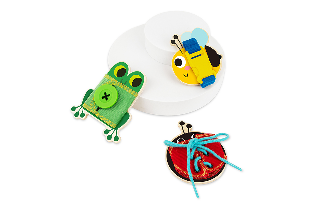 Κάθε ζωάκι προσφέρει τη δυνατότητα εξάσκησης σε διαφορετική δεξιότητα. Ο βάτραχος μαθαίνει στο παιδί να κουμπώνει και να ξεκουμπώνει ένα κουμπί, η μέλισσα μαθαίνει να ανοίγει και να κλείνει έναν ιμάντα, να δένει και να λύνει κορδόνια.
