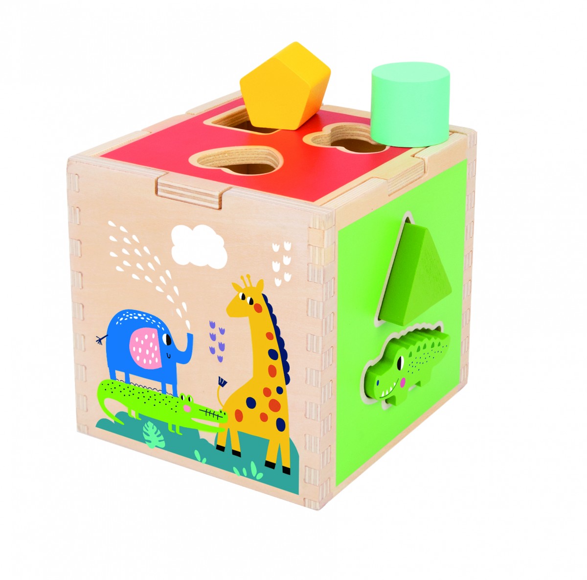 Ο Ξύλινος Κύβος βοηθάει το παιδί να μάθει τα χρώματα, τα σχήματα και τα ζωάκια. Αναπτύσσει την κριτική και λογική ικανότητά του, καθώς κάθε σφήνωμα αντιστοιχεί μόνο σε ένα άνοιγμα. Επίσης, το παιδί αποκτά καλύτερο έλεγχο των κινήσεών του και αναπτύσσει την παρατηρητικότητα του. Τα έντονα χρώματα στον κύβο, τα σχήματα και τα ζωάκια, έλκουν την προσοχή του παιδιού και διατηρούν το ενδιαφέρον του για ώρα.