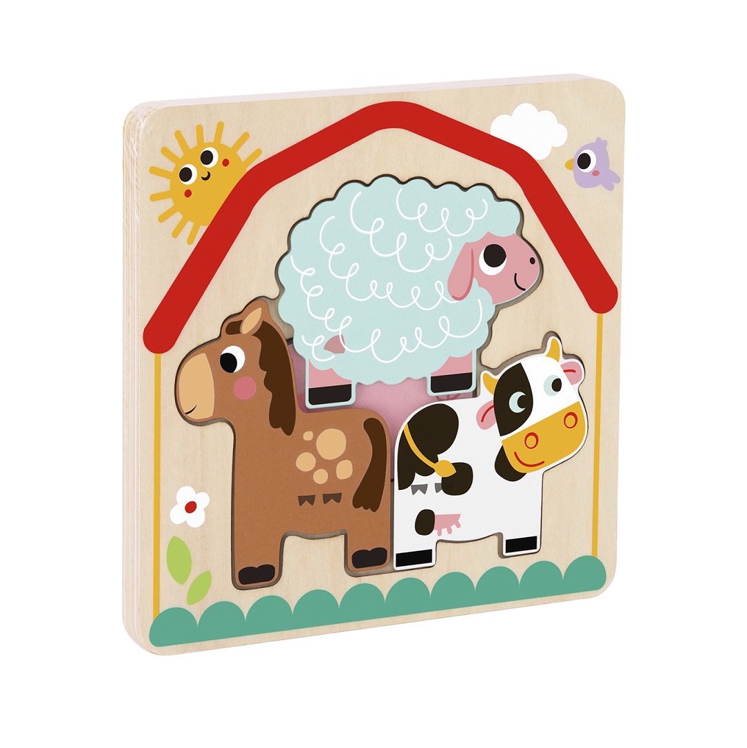 Το Ξύλινο Παζλ Πολλαπλών Επιπέδων Φάρμα περιέχει 7 διαφορετικά τεμάχια. Στη βάση του παιχνιδιού το παιδί καλείται να τοποθετήσει τα διαφορετικά κομμάτια του παζλ μεμονωμένα ή όλα μαζί στη θέση τους.