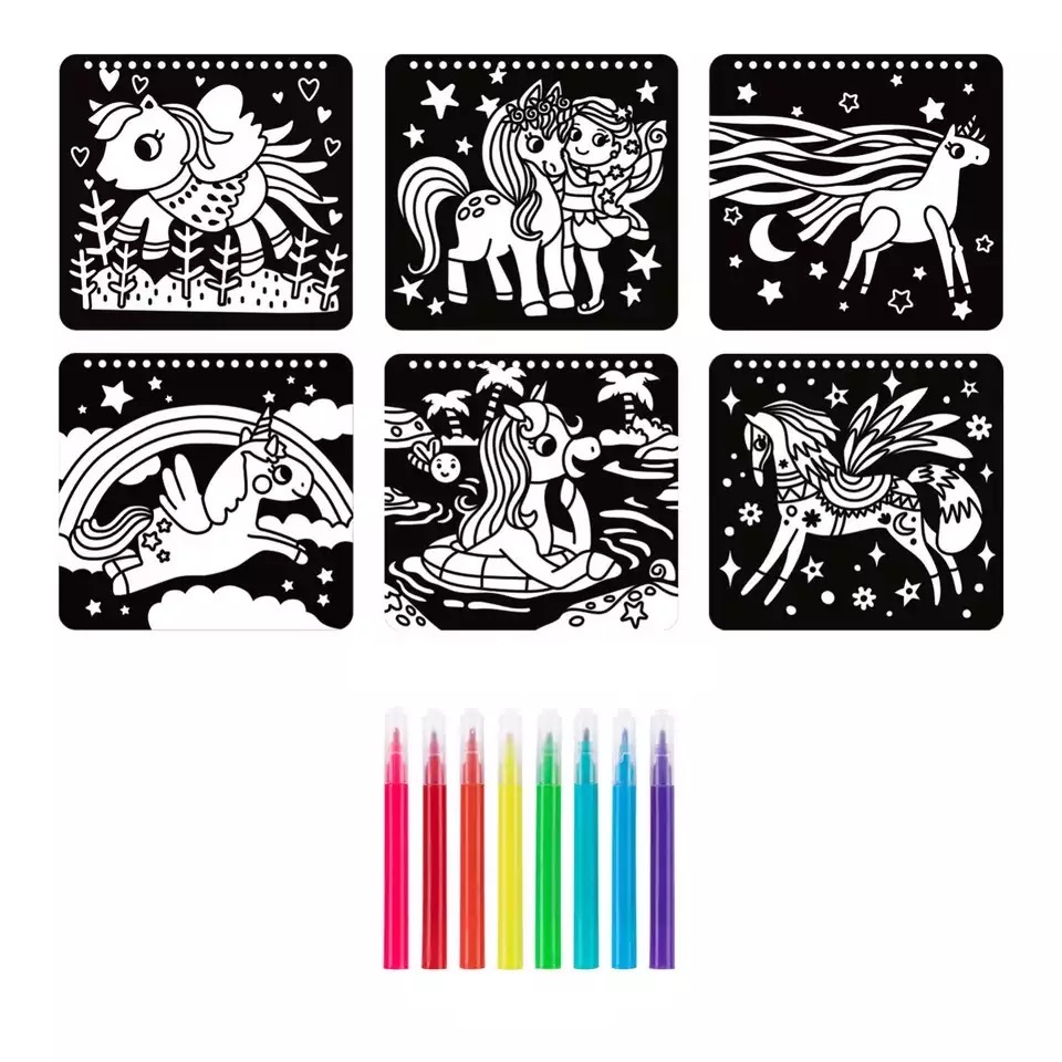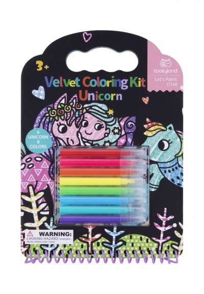 Το σετ ζωγραφικής σε βελούδο μονόκεροι θα ενθουσιάσει τους μικρούς καλλιτέχνες! Περιλαμβάνει 6 σελίδες για χρωματισμό με μονόκερους και 8 μαρκαδόρους σε διαφορετικά χρώματα. Οι σελίδες του σετ έχουν τρύπες στο πάνω μέρος τους, ώστε να μπορούν να κοπούν εύκολα. Έχουν βελούδινη υφή και όταν χρωματιστούν αποκαλύπτονται σχέδια ως δια μαγείας. Το σετ ζωγραφικής διαθέτει λαβή στο πάνω μέρος, έτσι ώστε να είναι εύκολο στη μεταφορά. Κατάλληλο για ηλικίες άνω των 3 ετών.