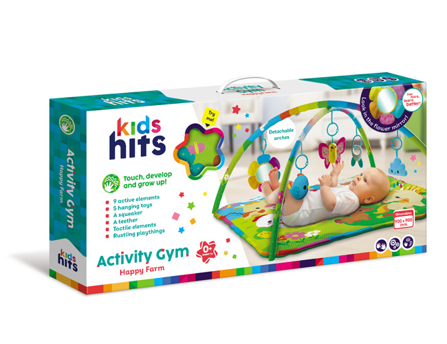 Το Βρεφικό Γυμναστήριο Χαρούμενη Φάρμα είναι το ιδανικό παιχνίδι για κάθε παιδί! Το Γυμναστήριο αποτελείται από ύφασμα ευχάριστο στην αφή με ανάγλυφες λεπτομέρειες. Τα πέντε πολύχρωμα παιχνιδάκια που κρέμονται από τις αποσπώμενες αψίδες, προσφέρουν ατελείωτες ώρες διασκέδασης και εξασκούν τις λεπτές κινητικές δεξιότητες. Τα χαρούμενα χρώματα και η ποικιλία ήχων προάγουν την οπτική και ακουστική ικανότητα του παιδιού, δημιουργώντας ένα περιβάλλον διασκέδασης και ασφάλειας.