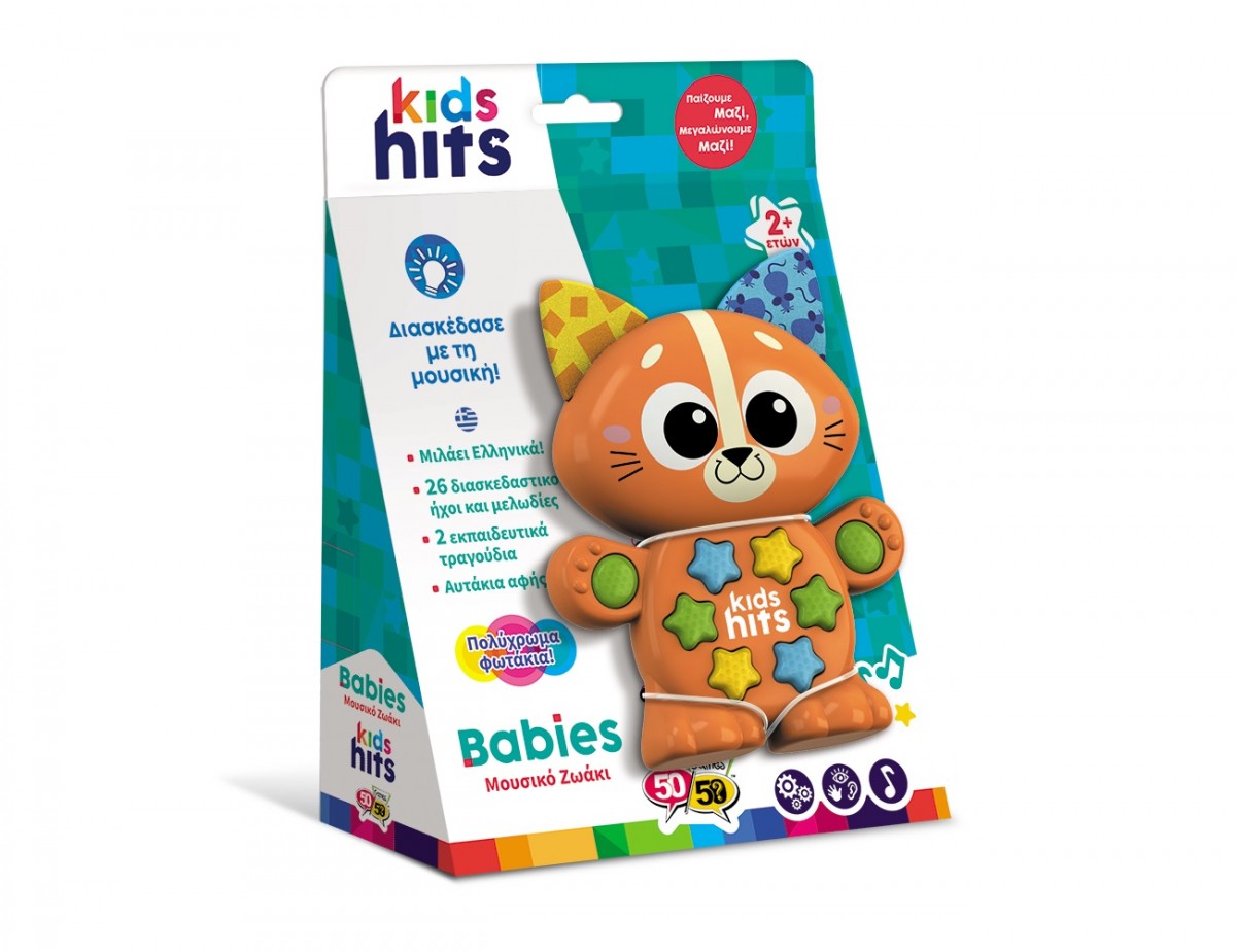 Με το Babies Μουσικό Ζωάκι Γατάκι το παιδί μαθαίνει στα ελληνικά την αλφάβητο και την αρίθμηση μέσα από διασκεδαστικές ασκήσεις. Οι αστείοι ήχοι και οι μελωδίες καλλιεργούν το ενδιαφέρον του για τη μουσική και το ενθαρρύνουν να τραγουδήσει και να χορέψει στο άκουσμα χαρούμενων τραγουδιών. Μια μεγάλη μουσική περιπέτεια ξεκινά! Διατίθεται σε τρία σχέδια: κουτάβι, γατάκι και λαγουδάκι.