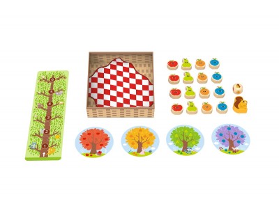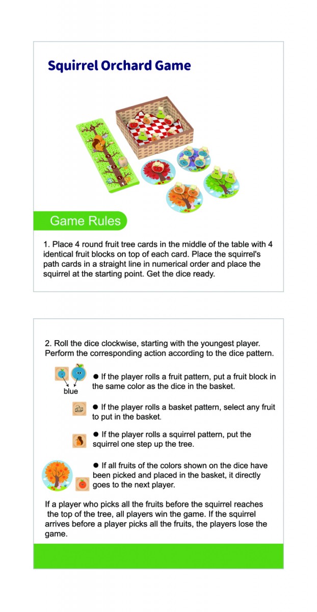 - Αν τύχει η επιλογή με όλα τα χρώματα, χάνετε τη σειρά σας. Αν ο παίκτης καταφέρει να μαζέψει πρώτος όλα τα φρούτα, τότε κερδίζει. Αν προλάβει ο σκίουρος να φτάσει πρώτος στον προορισμό του, τότε κερδίζει εκείνος. Αποτελείται από 29 τεμάχια και απευθύνεται σε παιδιά άνω των 18 μηνών.