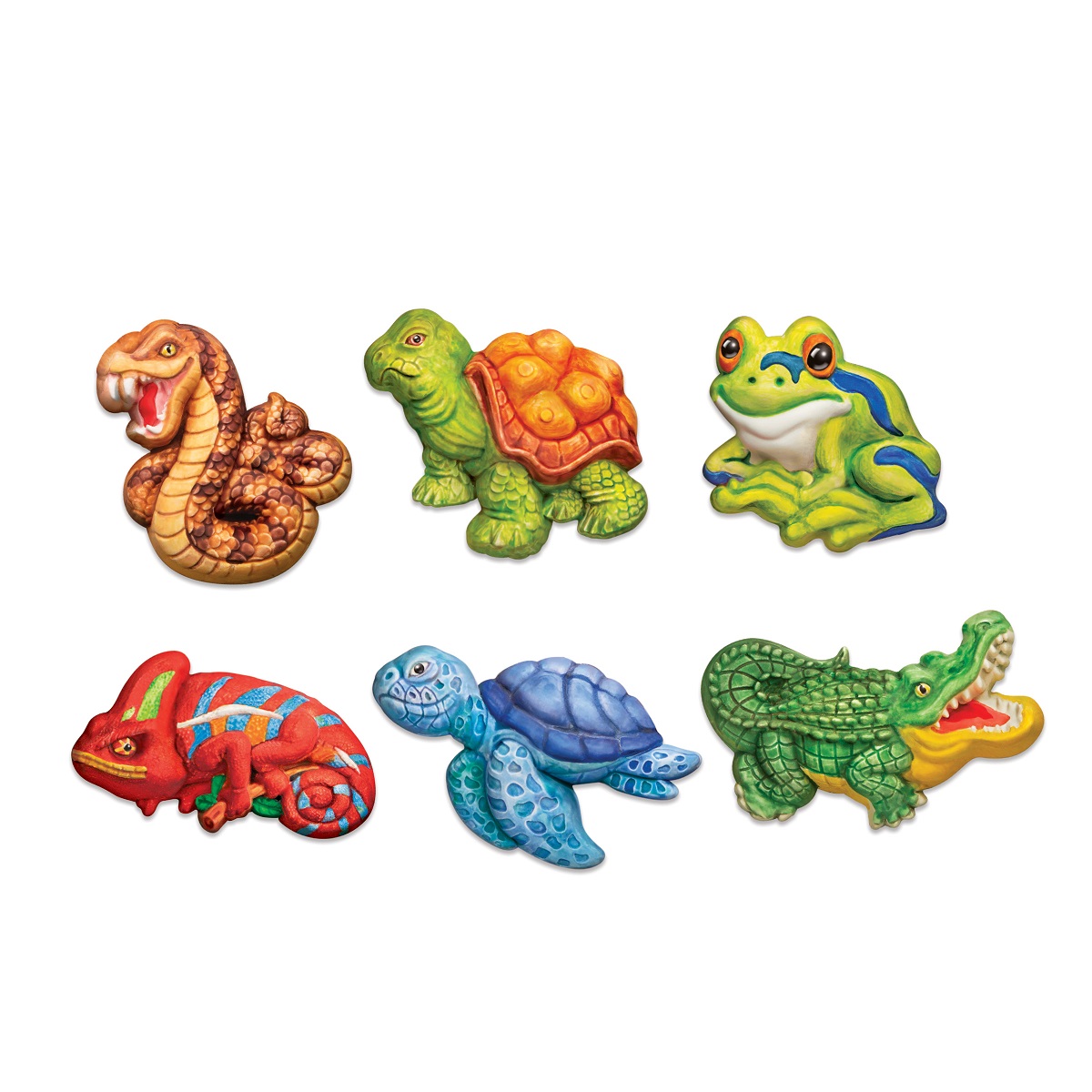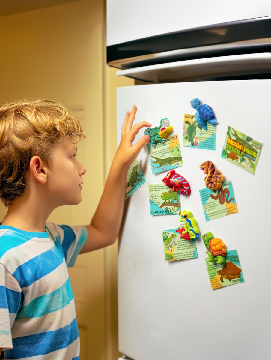 ΠΑΡΑΣΚΕΥΗ: Προετοίμασε τον γύψο ακολουθώντας τις οδηγίες και ρίξε το μείγμα στο καλούπι. Περίμενε λίγο μέχρι να σταθεροποιηθεί και έπειτα αφαίρεσέ τον και χρωμάτισε τα ερπετά και αμφίβια με τα χρώματα που περιλαμβάνονται. Άφησε τα να στεγνώσουν εντελώς. Έπειτα κόλλησε στην πίσω επίπεδη πλευρά τους μαγνήτες ή τις ειδικές καρφίτσες και δημιούργησε έτσι τους τέλειους μαγνήτες για το ψυγείο σου ή κονκάρδες για τα ρούχα και την τσάντα σου.