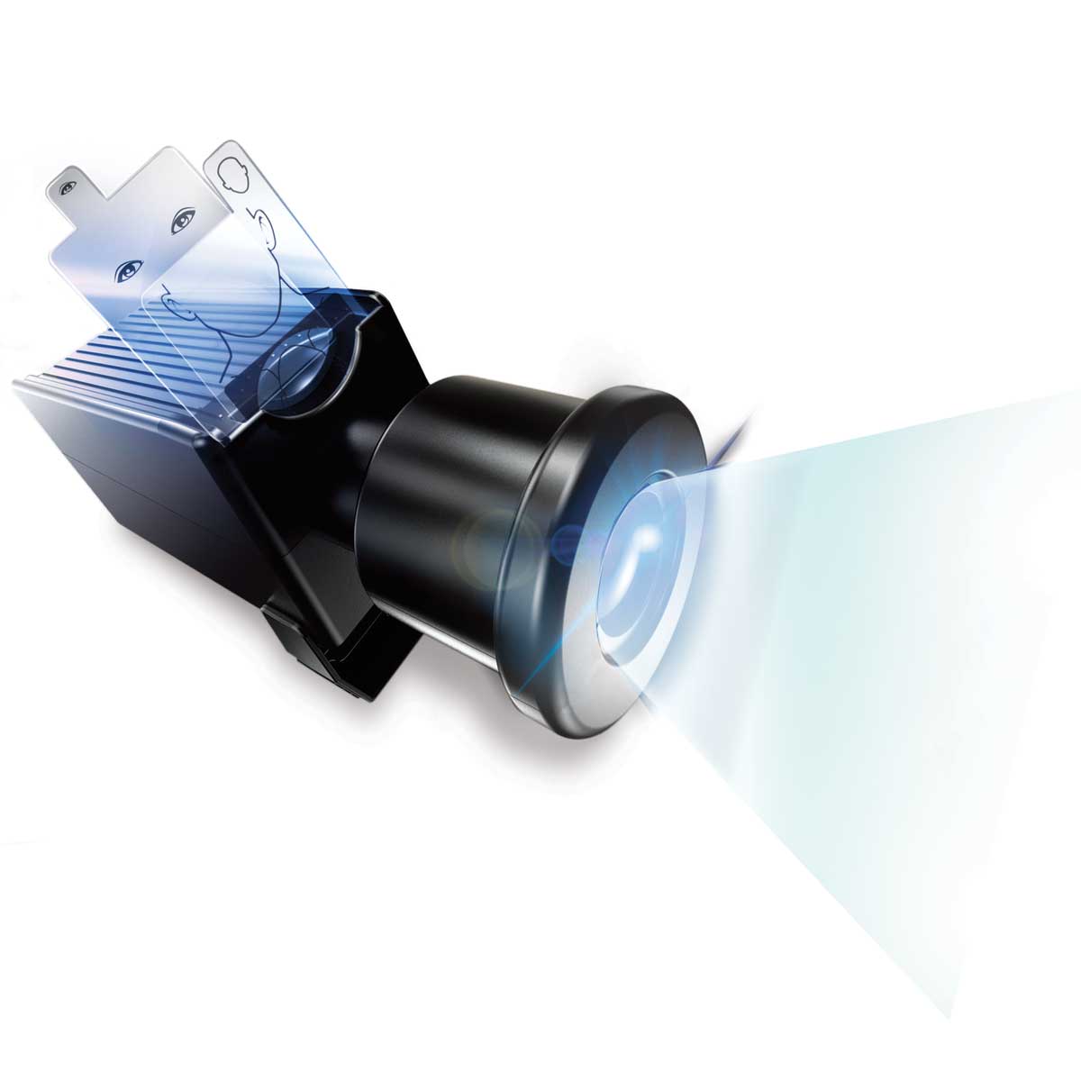 ΤΡΟΠΟΣ ΛΕΙΤΟΥΡΓΙΑΣ: Η μπαταρία δίνει ισχύ σε μια ανοιχτόχρωμη λάμπα LED στο εσωτερικό του προτζέκτορα. Ακτίνες φωτός από την λάμπα διαπερνούν τις διαφάνειες. Κατόπιν οι ακτίνες περνάνε μέσα από έναν φακό. Ο φακός κάμπτει τις ακτίνες έτσι ώστε όλες οι ακτίνες από ένα σημείο στα φιλμ να συναντάνε (εστιάζουν) στον τοίχο. Οι ακτίνες φωτός από το άνω μέρος των φιλμ συναντώνται στο κάτω μέρος της εικόνας και αντίστροφα, έτσι ώστε η εικόνα να είναι αναποδογυρισμένη σε σύγκριση με τα φιλμ. Το φιλμ βρίσκεται λίγα εκατοστά μακριά από τον φακό. Ο φακός κάμπτει τις ακτίνες φωτός από κάθε σημείο στο φιλμ έτσι ώστε να συναντώνται πολύ πιο μακριά. Έτσι, η εικόνα γίνεται πολύ μεγαλύτερη στον τοίχο από ό,τι η εικόνα στο φιλμ.