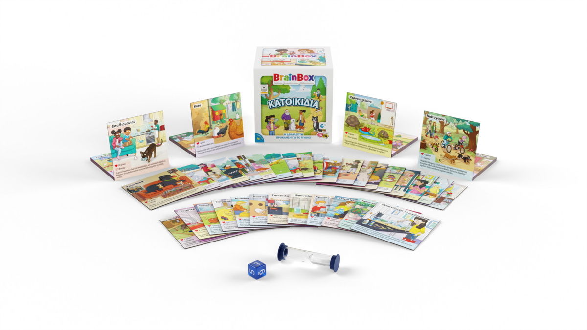 Ανακάλυψε τα πιο απίθανα κατοικίδια ζώα στον κόσμο με το BrainBox Κατοικίδια! Από ράτσες γατών και σκύλων μέχρι συναρπαστικά είδη φιλικών ερπετών και ψαριών, το οικογενειακό αυτό παιχνίδι είναι εδώ για να διασκεδάσει μικρούς και μεγάλους. Διάλεξε μια κάρτα μέσα από το BrainBox. Αναποδογύρισε την κλεψύδρα και προσπάθησε να τη μάθεις απ' έξω σε 10 δευτερόλεπτα! Τώρα ρίξε το ζάρι και απάντησε στην αντίστοιχη ερώτηση. Αν απαντήσεις σωστά κρατάς την κάρτα, αν απαντήσεις λάθος βάζεις την κάρτα πάλι μέσα στο BrainBox.