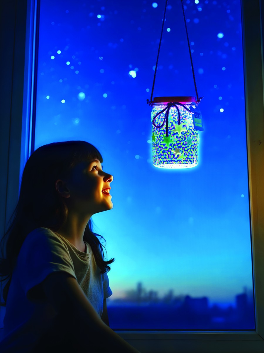 ΠΕΡΙΕΧΟΜΕΝΑ: βάζο x 1, καπάκι βάζου με μπλε μονάδα LED x 1 (περιλαμβάνει 2 μπαταρίες κουμπιού 1,5v AG13/LR44), εργαλείο ζωγραφικής για κουκκίδες x 1, κορδόνι x 1, γάντζος x 1, μπογιές, μεγάλα φωσφορίζοντα αστέρια x 4 (διάφορα χρώματα), μικρά φωσφορίζοντα αστέρια x 12 (διάφορα χρώματα), αυτοκόλλητες ταινίες διπλής όψης x 1, ετικέτα δώρου x 1. Επίσης, απαιτείται, αλλά δεν περιλαμβάνεται σε αυτή τη συσκευασία: ένα μικρό σταυροκατσάβιδο.
