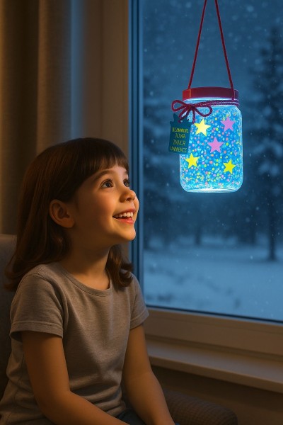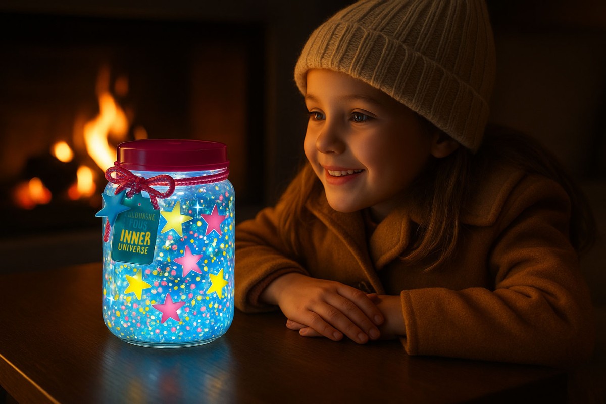 Ζωγράφισε το βάζο με το ειδικό εργαλείο για κουκκίδες. Κόλλησε μικρά και μεγάλα, λαμπερά αστέρια για να το διακοσμήσεις και γράψε ένα μήνυμα στην ετικέτα. Τοποθέτησε το καπάκι LED αφού αφαιρέσεις το προστατευτικό φύλλο και πάτησε το κουμπί. Απόλαυσε τα όμορφα μοτίβα γαλαξία που προβάλουν μέσα από το βάζο!