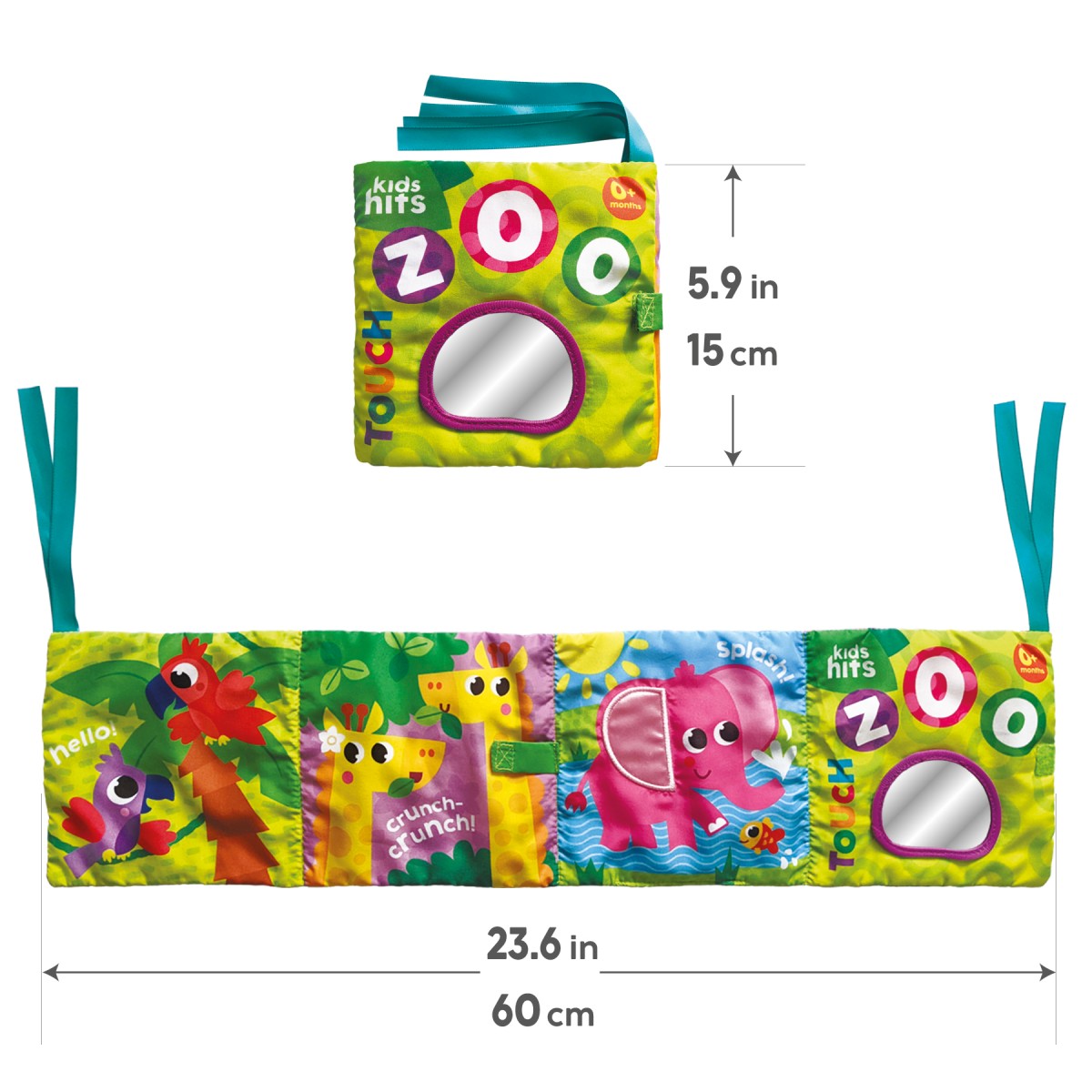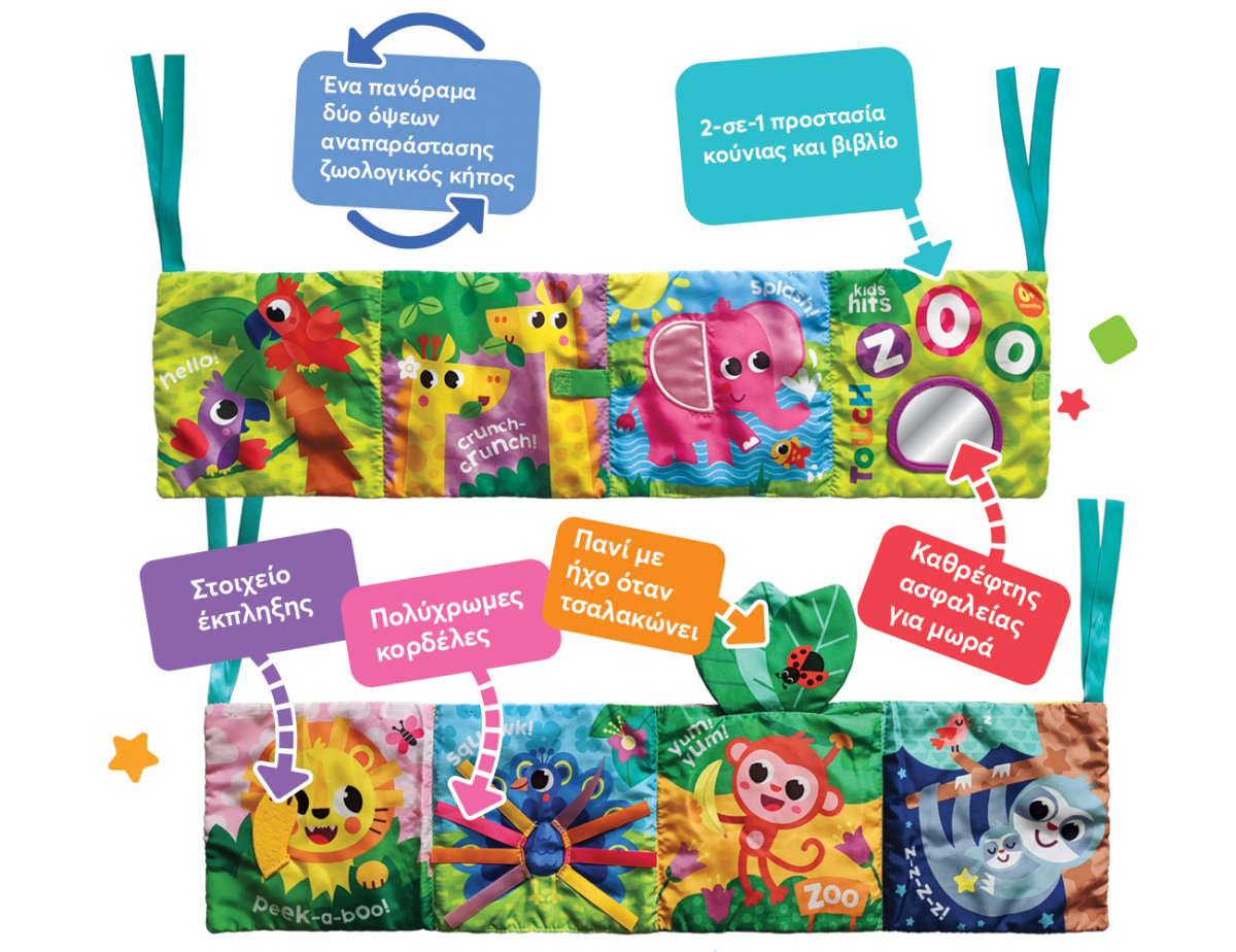 Κάντε το παιχνίδι του μωρού σας συναρπαστικό με ένα υπέροχο παιχνίδι 2 σε 1 - προστατευτικό κούνιας και βιβλίο! Αυτή η διπλής όψης πτυσσόμενη πανοραμική σκηνή ζωολογικού κήπου διαθέτει πολύχρωμα ζώα με σχέδιο κατάλληλο για την ηλικία και προσφέρει εκπληκτικά στοιχεία δραστηριότητας σε κάθε δίπλωμα - τα μικρά μπορούν να αγγίξουν διαφορετικές υφές, να ακούσουν ήχους, θροΐσματα, να παίξουν με το ασφαλές καθρεφτάκι για μωρά. Η εξερεύνηση των ερεθισμάτων αφής αυτού του πολυλειτουργικού προστατευτικού κούνιας είναι εξαιρετικά ωφέλιμη για τις λεπτές κινητικές δεξιότητες των μωρών και την ανάπτυξη του συντονισμού χεριού-ματιού. Το προστατευτικό στερεώνεται εύκολα στην κούνια, καθώς έχει πολλά λουράκια για δέσιμο. Μεγάλη διασκέδαση την ημέρα και απόλυτη ασφάλεια τη νύχτα!