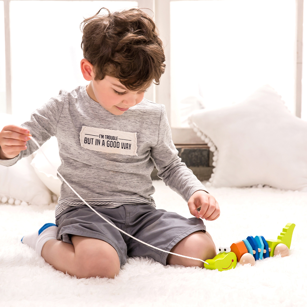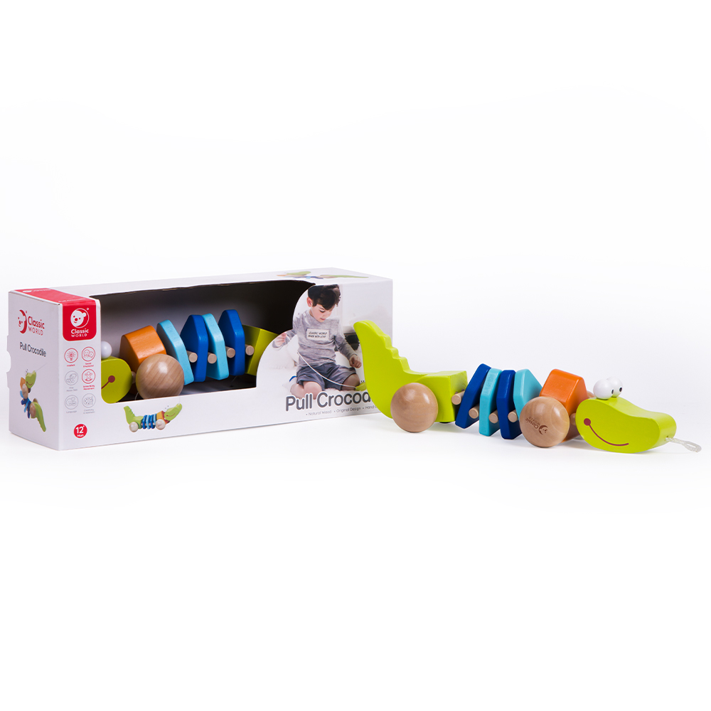 Ψάχνετε έναν νέο φίλο για το παιδί σας; Αυτός ο χαριτωμένος συρόμενος κροκόδειλος είναι ο ιδανικός σύντροφος για τις πρώτες του βόλτες μέσα στο σπίτι! Διαθέτει ευλύγιστο σώμα που λικνίζεται καθώς το παιδί τον τραβά, ενώ παράγει έναν διασκεδαστικό ήχο “κλικ-κλακ” που κάνει το παιχνίδι ακόμα πιο απολαυστικό. Ενθαρρύνει το δημιουργικό και μιμητικό παιχνίδι και συμβάλλει στην ενίσχυση των πρώιμων κινητικών δεξιοτήτων και του περπατήματος.