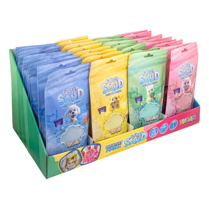 Το display περιέχει 32 φακελάκια Fluffy Sand σε τέσσερα χρώματα. Περιλαμβάνει από 8 φακελάκια σε ροζ, κίτρινο, πράσινο και μπλε. Κάθε φακελάκι περιέχει 90 γραμμάρια μαλακής άμμου.