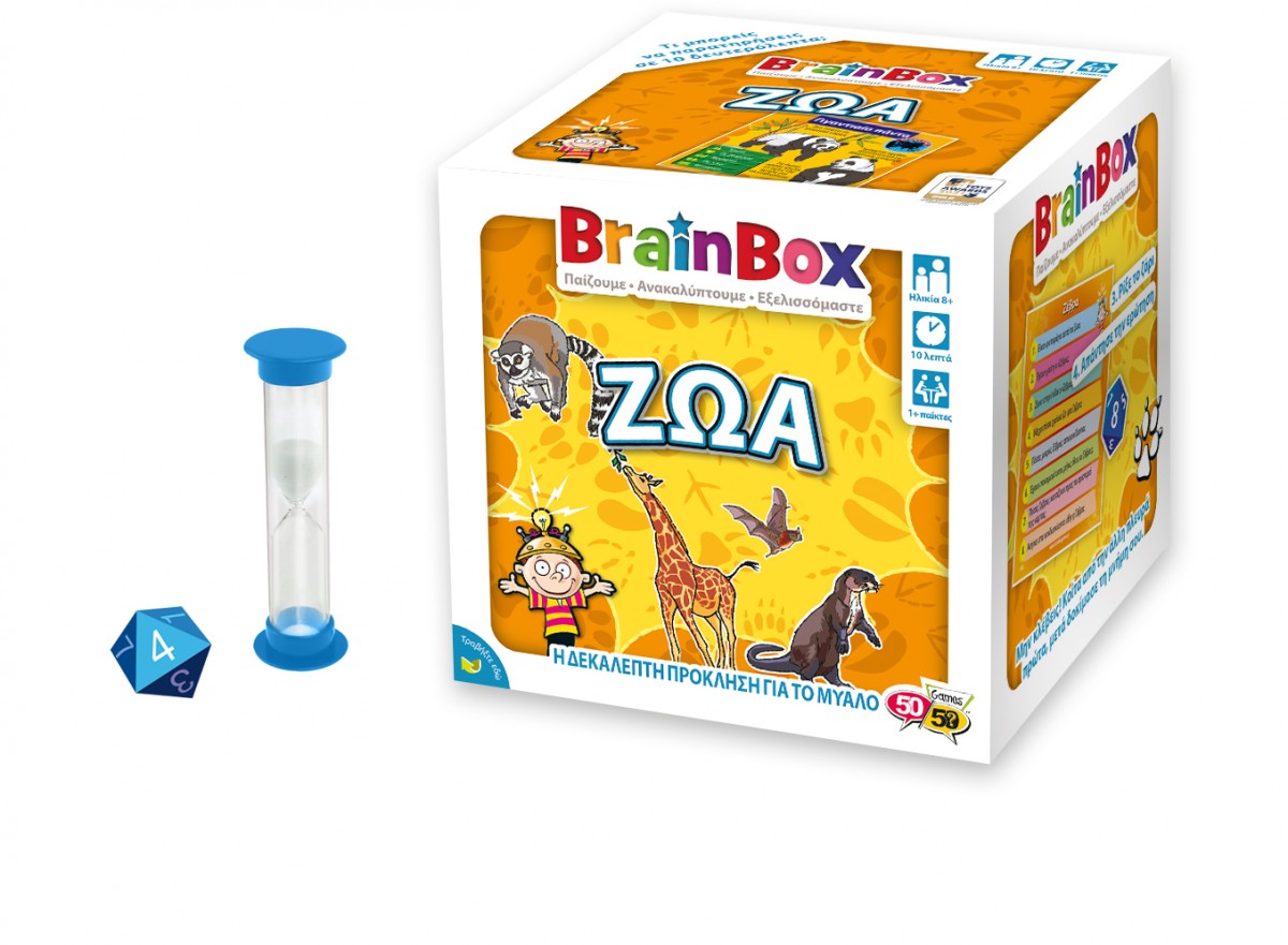 Εξερεύνησε το ζωικό βασίλειο με τον πιο διασκεδαστικό τρόπο! Διάλεξε μια κάρτα μέσα από το BrainBox. Αναποδογύρισε την κλεψύδρα και προσπάθησε να τη μάθεις απ'έξω μέσα σε 10 δευτερόλεπτα! Τώρα ρίξε το ζάρι και απάντα στην αντίστοιχη ερώτηση. Αν απαντήσεις σωστά κρατάς την κάρτα, αν απαντήσεις λάθος βάζεις την κάρτα και πάλι μέσα στο BrainBox.