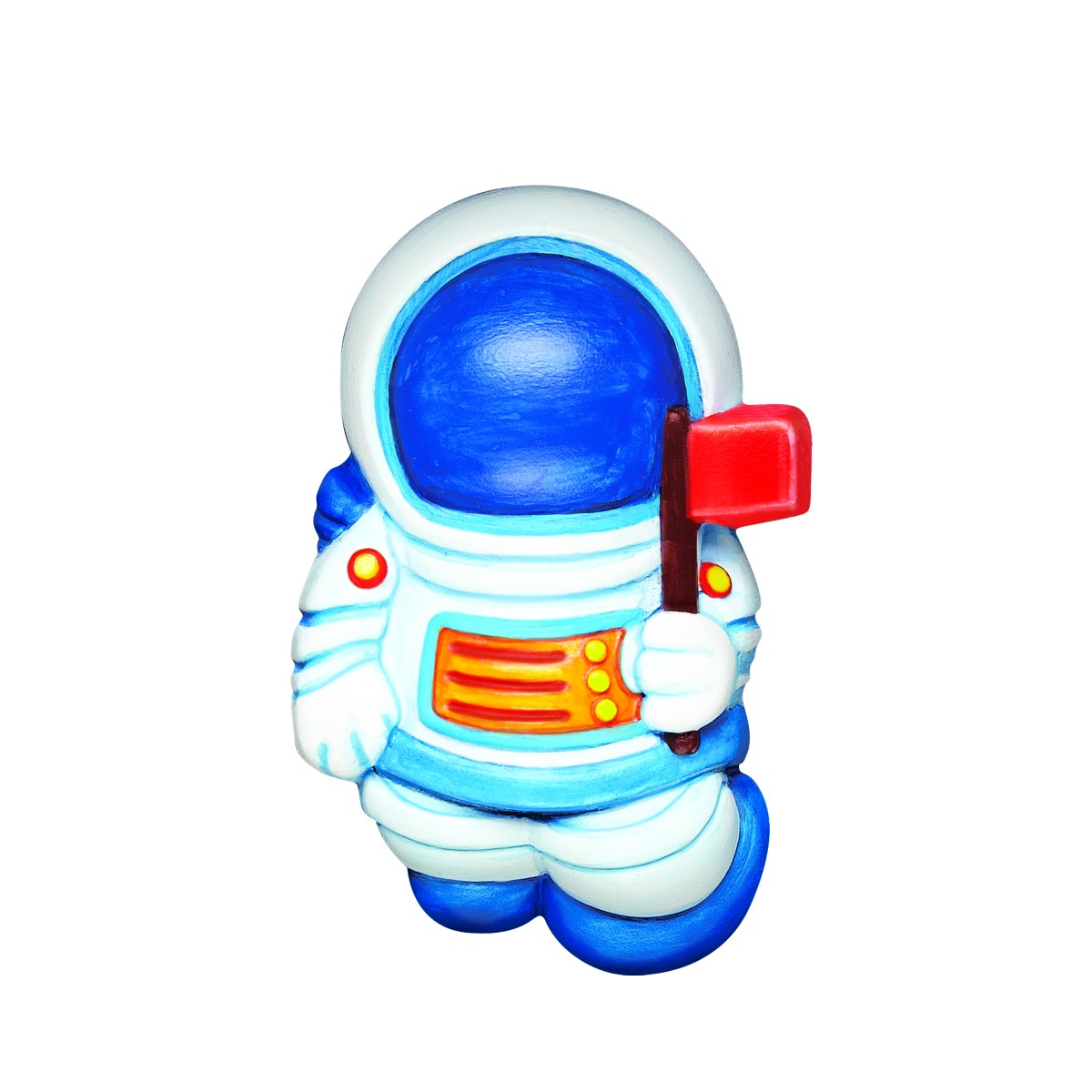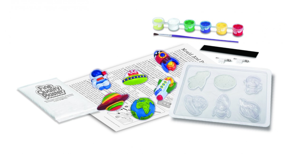 ΠΑΡΑΣΚΕΥΗ: Προετοίμασε το μείγμα του γύψου, ακολουθώντας πιστά τις οδηγίες όπως αναγράφονται στη συσκευασία. Ρίξε το μείγμα του γύψου στα καλούπια και ανακίνησε τα ελαφρά. Άφησε τον γύψο να στερεοποιηθεί για λίγη ώρα και ζωγράφισε τις διαστημικές φιγούρες με τα χρώματα που περιλαμβάνονται.