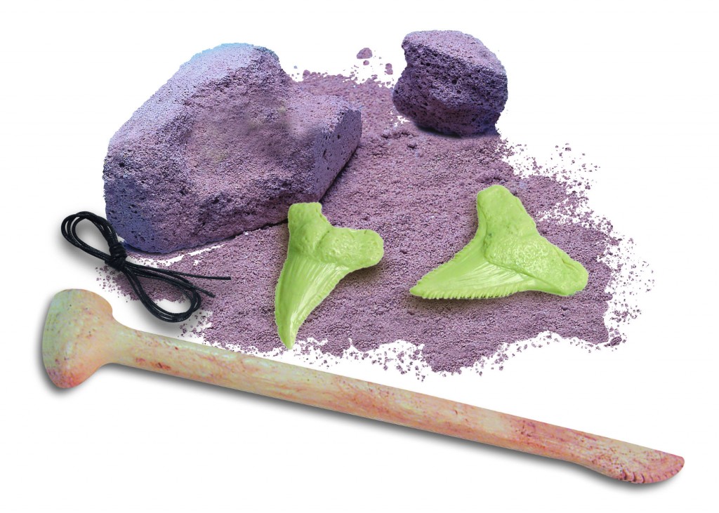 Κάνε ανασκαφή! Σπάσε το αυγό με το ειδικό σφυράκι και βρες δυο δόντια καρχαρία. Με το σχοινάκι που περιέχει μπορείς να φτιάξεις δυο καταπληκτικά κολιέ. Μόλις τα δόντια του καρχαρία αρχίσουν να εμφανίζονται, χρησιμοποίησε το ειδικό εργαλείο για να αφαιρέσεις τον γύψο που τα περιβάλλει.