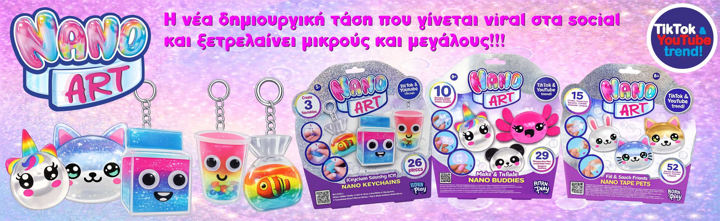 Το Nano Tape  είναι ένα σύγχρονο DIY παιχνίδι που έχει κερδίσει μικρούς και μεγάλους με την απλότητά του και το εντυπωσιακό αποτέλεσμα. Με βασικό υλικό τη διάφανη, ελαστική nano ταινία, τα παιδιά μπορούν να δημιουργήσουν squishy φούσκες, μπαλάκια και ζουληχτές κατασκευές που φουσκώνουν με αέρα και διακοσμούνται όπως ακριβώς τα φανταστούν. Η nano ταινία κόβεται, διπλώνεται και κολλάει εύκολα, επιτρέποντας τη δημιουργία μικρών φουσκών γεμάτων αέρα με ό,τι διακοσμητικά προτιμάς! Glitter, slime,…