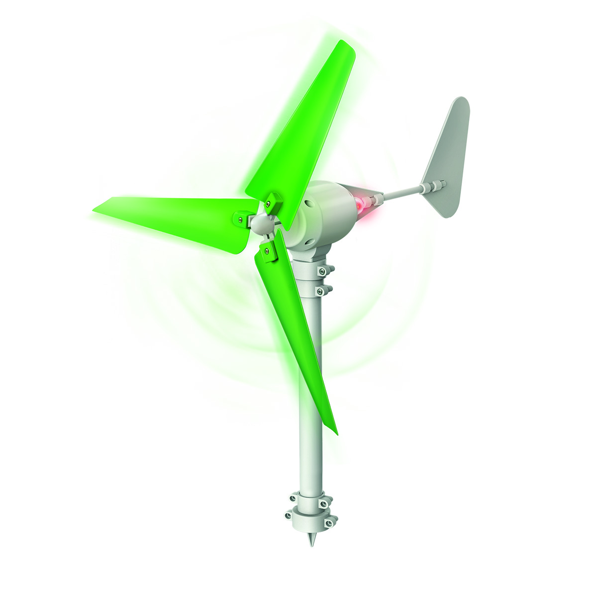 ΤΡΟΠΟΣ ΛΕΙΤΟΥΡΓΙΑΣ: Ο άνεμος μετακινεί τον αέρα και οτιδήποτε κινείται έχει ενέργεια. Η πλευρά του πτερυγίου μετατρέπει την ηλιακή ενέργεια σε μία περιστροφική δύναμη και αυτό κάνει το στροφείο να γυρίζει. Η ανεμογεννήτρια αιχμαλωτίζει την αιολική ενέργεια και τη μεταφέρει στη γεννήτρια μέσω του κεντρικού άξονα με το στροφείο και του άξονα. Η γεννήτρια μετατρέπει την κινητική ενέργεια του στροφείου σε ηλεκτρική ενέργεια, η οποία ανάβει το LED. Ο ανεμοδείκτης κάνει το στροφείο να κοιτάει προς την κατεύθυνση του ανέμου για να σιγουρέψει ότι το στροφείο συλλέγει όσο περισσότερο άνεμο είναι δυνατόν. Αν το στροφείο κοιτάει πλάγια και όχι προς τον άνεμο, ο άνεμος σπρώχνει την πλευρά του ανεμοδείκτη, ο οποίος κάνει το θάλαμο να γυρίσει μέχρι να κοιτάζει το στροφείο τον άνεμο.