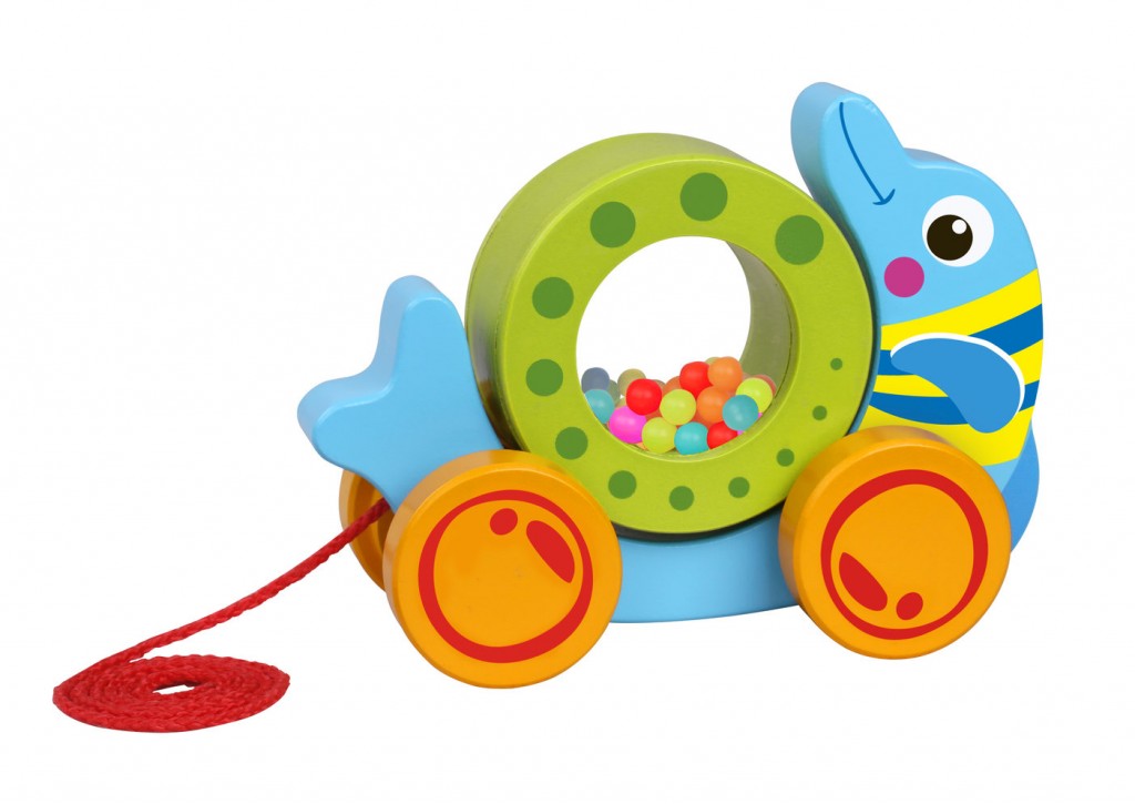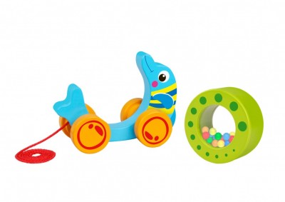 Με αυτό το ξύλινο δελφίνι το παιδί μπορεί να διασκεδάσει κάνοντας βόλτες με το συρόμενο ζωάκι, βελτιώνοντας με αυτόν τον τρόπο τον συντονισμό κινήσεων και αναπτύσσοντας τις κινητικές του δεξιότητες. Παράλληλα τα ζωηρά χρώματα των βόλων που κινούνται και ο ήχος που παράγουν, κεντρίζουν το ενδιαφέρον και οξύνουν την παρατηρητικότητά του. Με έντονα χρώματα, αποτελεί ένα αγαπημένο κλασικό συρόμενο παιχνίδι, κατάλληλο για παιδιά βρεφικής ηλικίας.