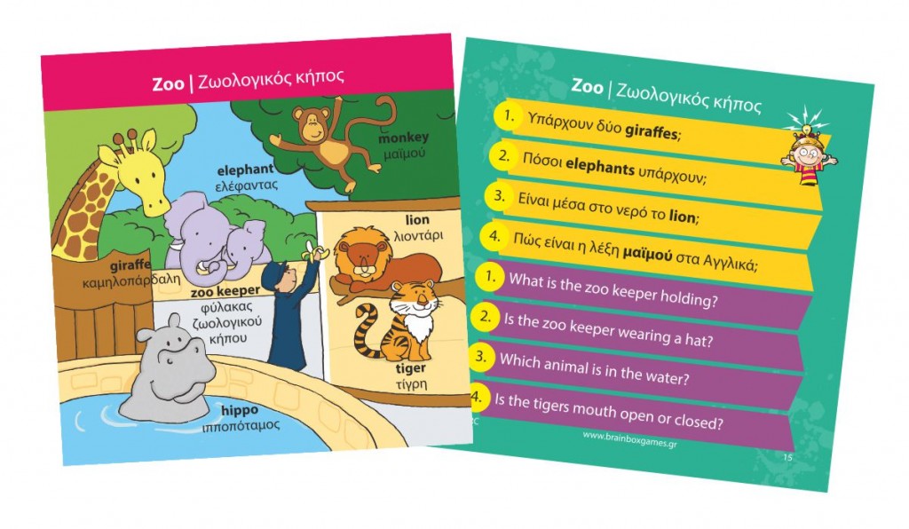 Αυτό το BrainBox θα βελτιώσει την παρατηρητικότητα και τις μνημονικές ικανότητες των παιδιών, ενώ παράλληλα θα αναπτύξει το λεξιλόγιό τους στα Αγγλικά. Κάθε κάρτα δείχνει μία εικόνα με λέξεις στα Αγγλικά και τα Ελληνικά. Το πίσω μέρος της κάρτας έχει δύο επίπεδα ερωτήσεων, ένα για αρχάριους και ένα για όσους έχουν μεγαλύτερη αυτοπεποίθηση.