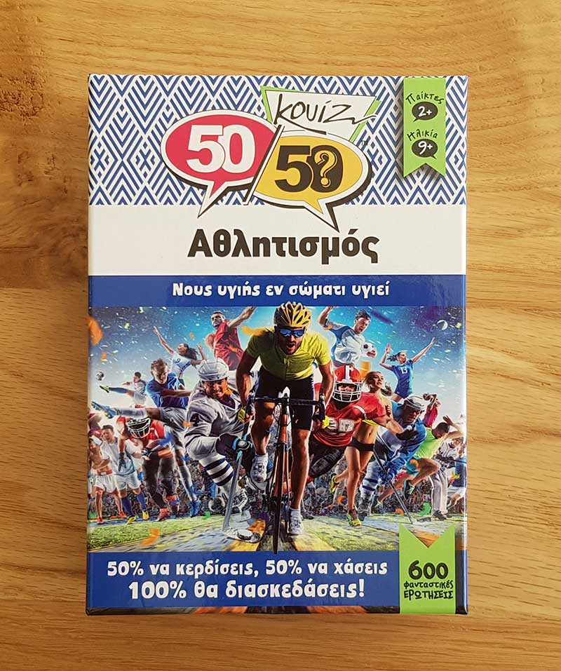 Η πεταλούδα είναι τεχνική κολύμβησης ή στίβου; Από πού προέρχεται η φράση «Έγινε Λούης»; Στο άλμα εις ύψος ή στο άλμα επί κοντώ χρησιμοποιείται κοντάρι; Τέσταρε τις γνώσεις σου και συναγωνίσου τους φίλους σου με το νέο επιτραπέζιο ερωτήσεων 50-50 Κουίζ Αθλητισμός! Με 600 ερωτήσεις που καλύπτουν ποικίλα θέματα, μαθαίνεις τις πιο ενδιαφέρουσες και αξιοπερίεργες πληροφορίες.