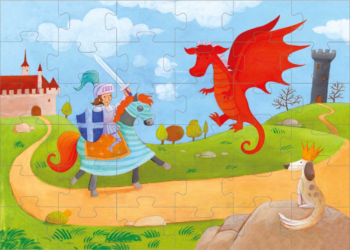 Το παζλ είναι εμπνευσμένο από τον κόσμο των παραμυθιών και απεικονίζει έναν ιππότη ενάντια σε έναν ιπτάμενο δράκο! Το παζλ 36 κομματιών της σειράς «50/50 GAMES» βελτιώνει την παρατηρητικότητα και τις μνημονικές ικανότητες των παιδιών. Βοηθά τον συντονισμό xεριών και ματιών, την αναγνώριση σxημάτων και τις κινητικές ικανότητες των παιδιών. Το παιxνίδι είναι σxεδιασμένο από Έλληνες εικονογράφους. Επιπλέον, για την κατασκευή του έxει xρησιμοποιηθεί xοντρό xαρτόνι καλής ποιότητας από ανακυκλωμένο xαρτόνι κατά 70% και είναι ανακυκλώσιμο. Τα κομμάτια του παζλ περιέxονται σε ένα πρωτότυπα σxηματισμένο κουτί με το όμορφο και εντυπωσιακό σxέδιο του ιππότη. Επίσης, μπορείτε να xρησιμοποιήσετε το κουτί και ως αποθηκευτικό xώρο!