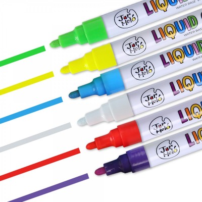 Μαρκαδόροι υγρής κιμωλίας με καπάκι ασφαλείας σε σετ 6 χρωμάτων. Μη τοξικοί και το υγρό τους αφαιρείται εύκολα από το δέρμα και τις λείες και μη πορώδεις επιφάνειες. Κουνήστε καλά πριν τη χρήση και πιέστε για 10 δευτερόλεπτα πριν αρχίσετε να γράφετε.