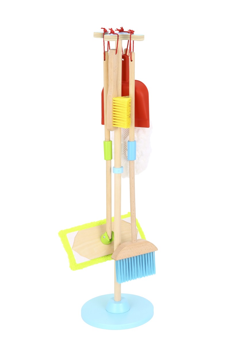 Το σετ αποτελείται από ένα ξεσκονόπανο, μια βούρτσα, μια σκούπα με ένα φαράσι κι μια παρκετέζα που είναι κατάλληλα σχεδιασμένα για παιδιά. Μέσω του παιχνιδιού με το σετ καθαριότητας αναπτύσσονται η φαντασία, οι νοητικές ικανότητες, η διαρκή προσοχή, η μνήμη και η γλώσσα και παράλληλα καλλιεργούνται οι κοινωνικές και κινητικές δεξιότητες.