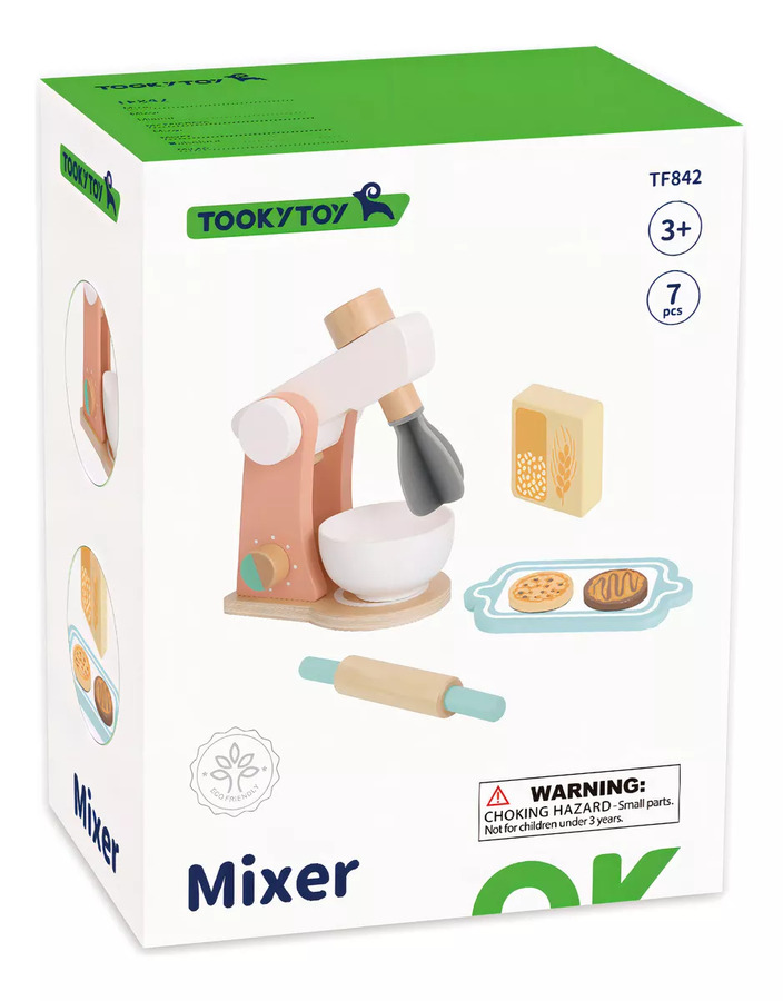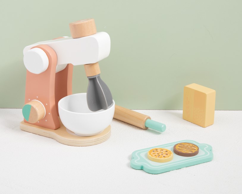 Το σετ αποτελείται από 6 ξύλινα τεμάχια: ένα μίξερ σε όμορφα χρώματα, ένα μπολ, ένας δίσκος σερβιρίσματος, ένα βούτυρο και δύο μπισκοτάκια.