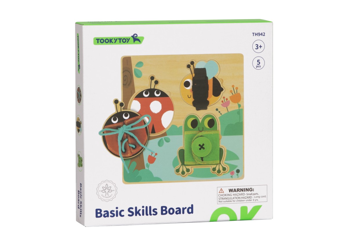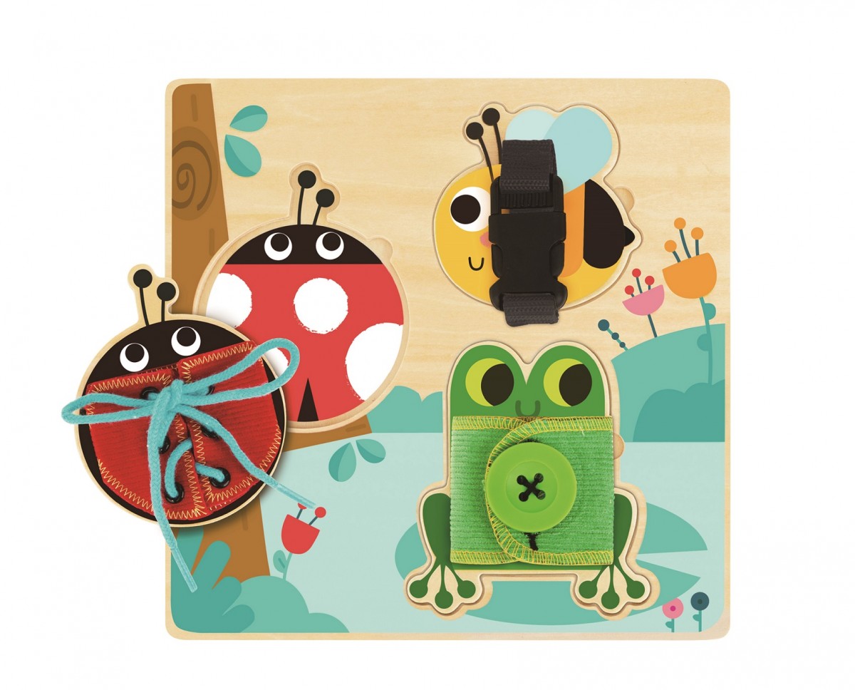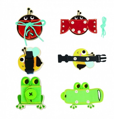 Κάθε ζωάκι προσφέρει τη δυνατότητα εξάσκησης σε διαφορετική δεξιότητα. Ο βάτραχος μαθαίνει στο παιδί να κουμπώνει και να ξεκουμπώνει ένα κουμπί, η μέλισσα μαθαίνει να ανοίγει και να κλείνει έναν ιμάντα, να δένει και να λύνει κορδόνια.