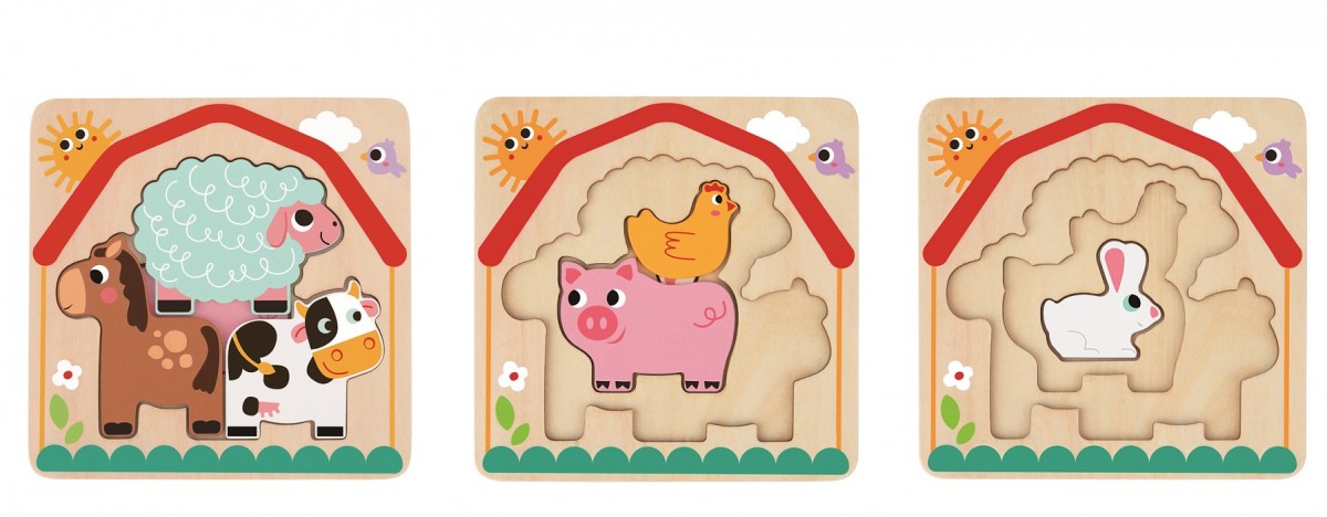 Τα κομμάτια του παζλ απεικονίζουν ζωάκια της φάρμας: ένα κουνελάκι, μια κότα, ένα γουρούνι, ένα άλογο, μια αγελάδα, ένα πρόβατο. Το σετ περιμβάνει μία βάση που διαθέτει εσοχές για να κατασκευάσουν τα παιδιά το παζλ ακολουθώντας το γραμμικό σχέδιο των ζώων.