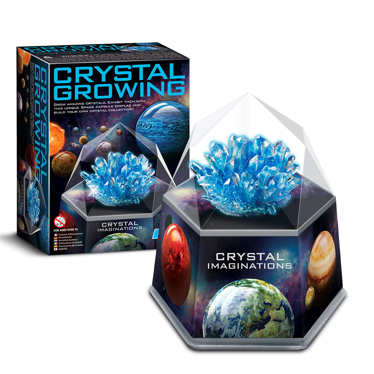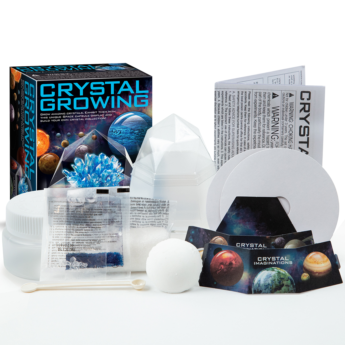 ΠΕΡΙΕΧΟΜΕΝΑ: σακούλα με λευκή χημική κρυσταλλική ένωση x1, σακούλα που περιέχει χρωστική ουσία x1, βάση κρυστάλλων x1, στρογγυλό χάρτινο κάλυμμα x1, χρωματιστό εξώφυλλο x1, κουτάλι ανάδευσης x1, κάλυμμα εκθεμάτων x1, δοχείο ανάδευσης/διαφανής βάση εκθεμάτων x1.