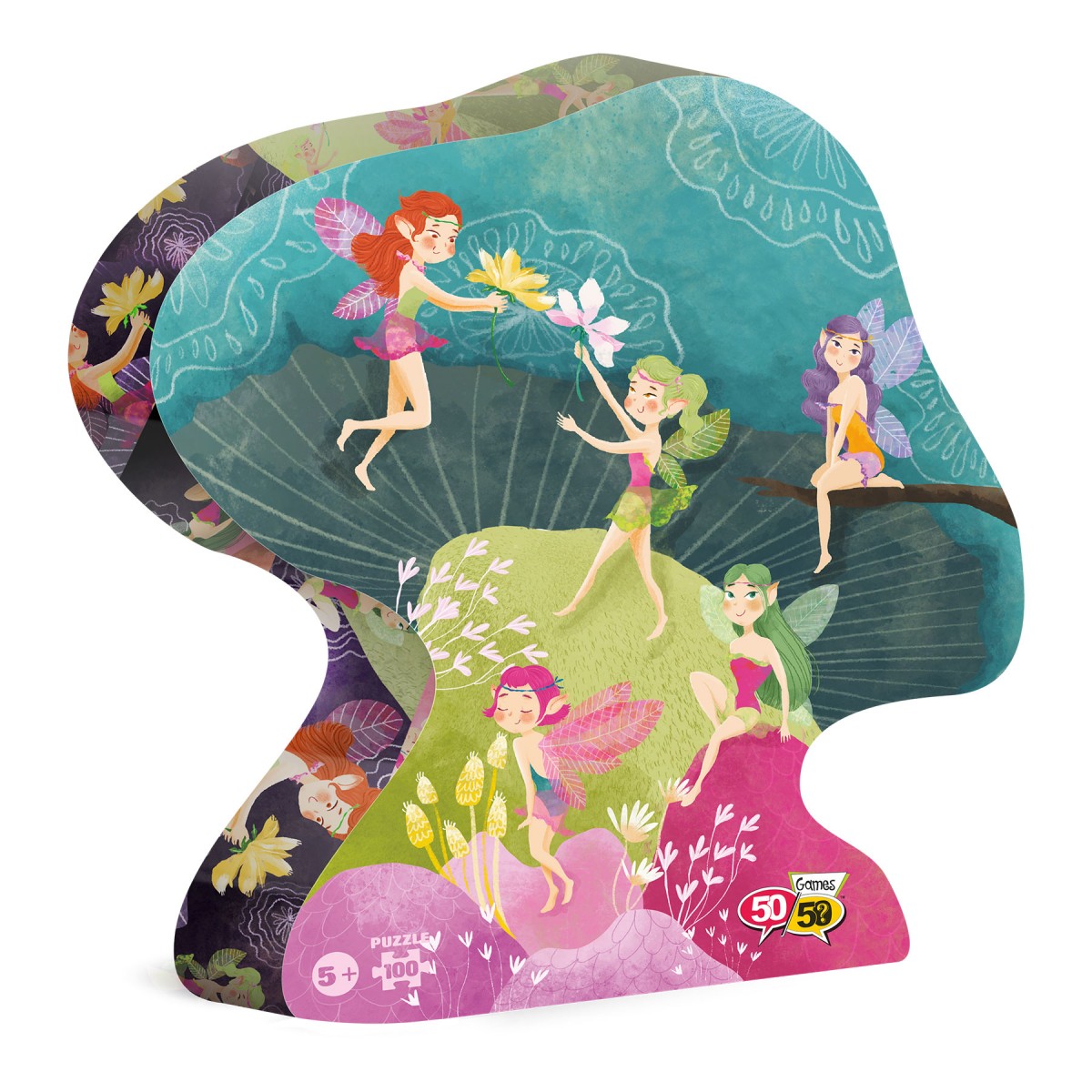 Το παζλ είναι εμπνευσμένο από τον κόσμο των νεράιδων και της φαντασίας και απεικονίζει πέντε μικρές νεραϊδούλες να κάθονται σε ένα μανιτάρι! Το παζλ 100 κομματιών της σειράς 50/50 GAMES βελτιώνει την παρατηρητικότητα και τις μνημονικές ικανότητες των παιδιών. Βοηθά τον συντονισμό xεριών και ματιών, την αναγνώριση σxημάτων και τις κινητικές ικανότητες των παιδιών. Το παιxνίδι είναι σxεδιασμένο από Έλληνες εικονογράφους. Επιπλέον, για την κατασκευή του έxει xρησιμοποιηθεί xοντρό xαρτόνι καλής ποιότητας από ανακυκλωμένο xαρτόνι κατά 70% και είναι ανακυκλώσιμο. Τα κομμάτια του παζλ περιέxονται σε ένα πρωτότυπα σxηματισμένο κουτί με το όμορφο και εντυπωσιακό σxέδιο ενός μανιταριού.