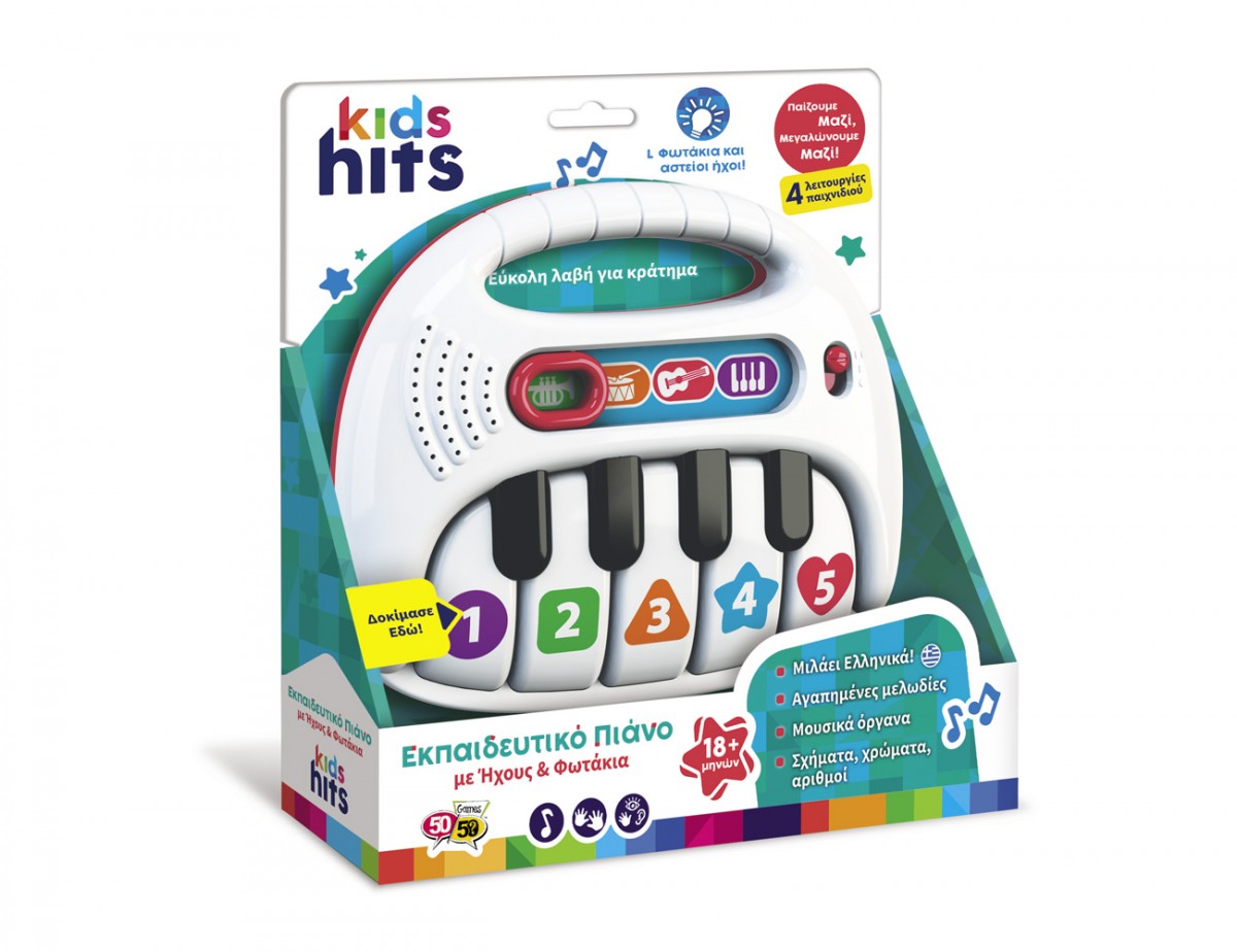 Με το Εκπαιδευτικό Πιάνο με Ήχους και Φωτάκια κάθε μικρός καλλιτέχνης θα ικανοποιήσει την περιέργεια του για τη μουσική! Το παιδί μπορεί να ακούσει χορευτικές μελωδίες, νανουρίσματα και ήχους μουσικών οργάνων. Οι τέσσερις διαφορετικές ρυθμίσεις του πιάνου δημιουργούν τις ιδανικές συνθήκες για την εκμάθηση των αριθμών, των σχημάτων και των χρωμάτων! Το παιχνίδι προάγει τη δημιουργικότητα και τη φαντασία του παιδιού, ενθαρύνοντας το να φτιάξει τις δικές του μοναδικές μουσικές συνθέσεις.