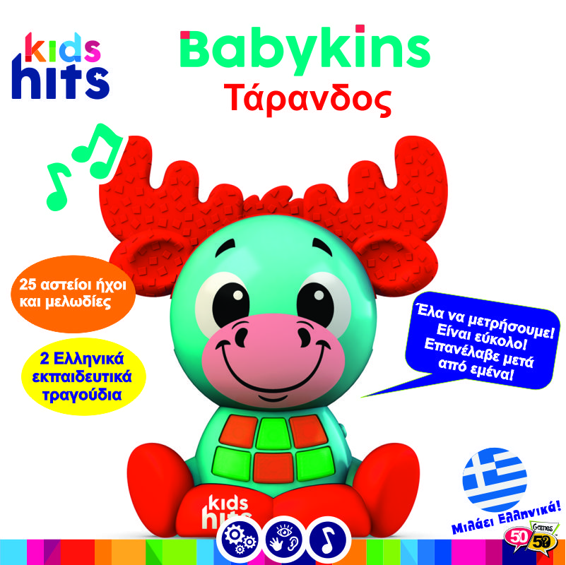 Το Babykins Ζωάκι Τάρανδος με τα χαρούμενα χρώματα και τους διασκεδαστικούς ήχους θα ενθουσιάσει κάθε παιδί! Τα ανάγλυφα κερατάκια του παιχνιδιού κινούνται κάνοντας κλικ. Πιέζοντας τα φωτεινά κουμπάκια, το παιδί επιλέγει να ακούσει τραγουδάκια στα Ελληνικά, χαρούμενες μελωδίες και αστείους ήχους. Τραγουδώντας την αλφάβητο και μαθαίνοντας αρίθμηση, κάθε μικρός φίλος θα διασκεδάσει αποκτώντας νέες γνώσεις! Διατίθεται σε τρία σχέδια: τάρανδος, καμηλοπάρδαλη και ζέβρα.