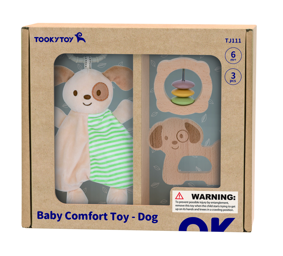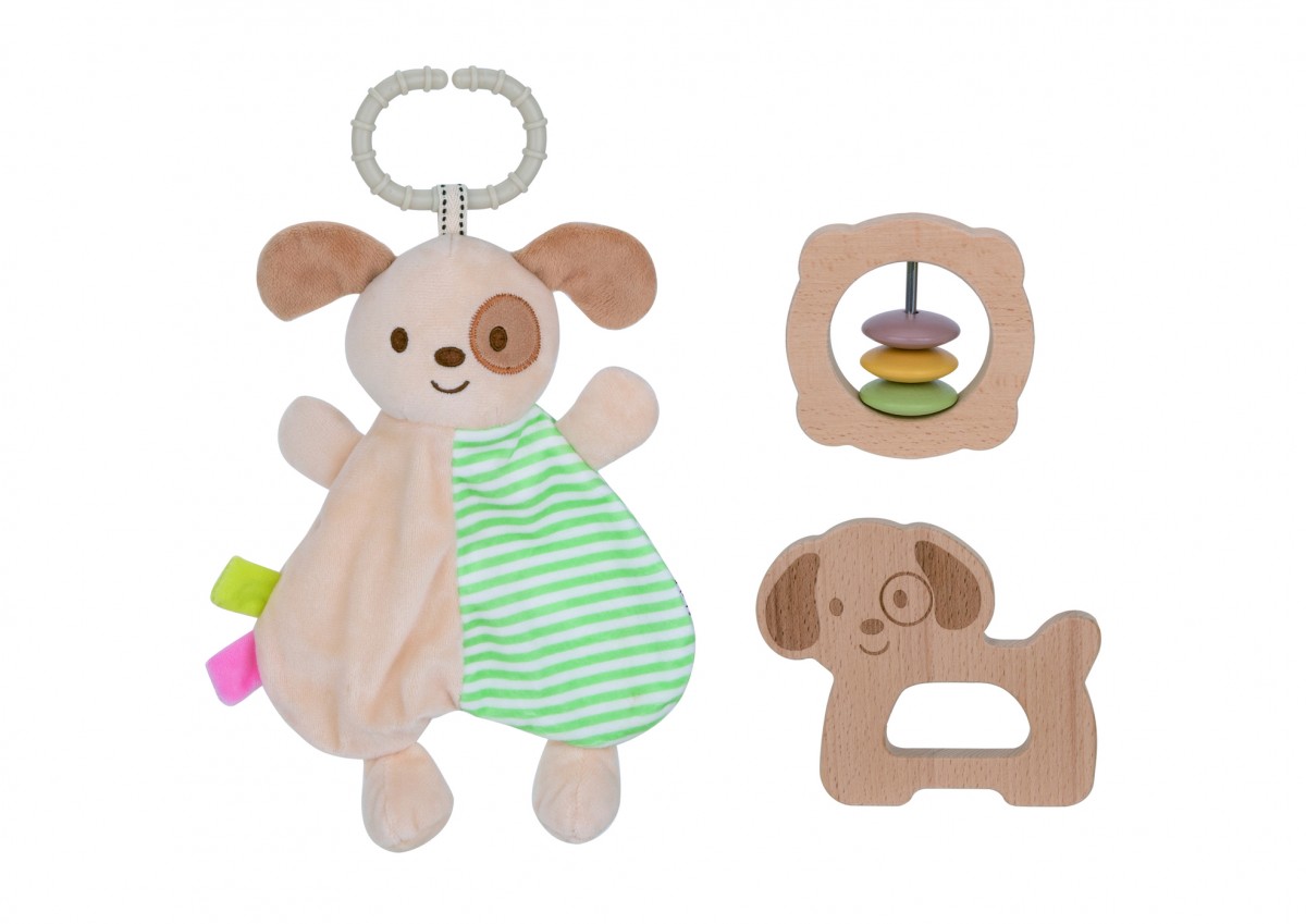 Αυτό το αξιολάτρευτο σετ ζωάκι συντροφιάς περιλαμβάνει ένα μαλακό, κρεμαστό λούτρινο παιχνίδι - σκύλος, ιδανικό για αγκαλιές και αισθητηριακή εξερεύνηση, προσφέροντας μια καθησυχαστική πινελιά συντροφιάς στην καθημερινότητα του μωρού. Το σετ περιλαμβάνει επίσης ένα ξύλινο μασητικό παιχνίδι σκυλάκι και μια κουδουνίστρα με 3 χάντρες για πρόκληση αισθητηριακού ήχου και απτικής ευχαρίστησης. Παρακολουθήστε τα μάτια του μικρού σας να φωτίζουν από χαρά καθώς δένεται με τον νέο του χνουδωτού φίλου.