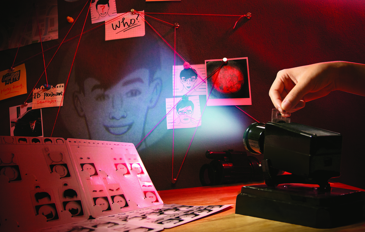 Απελευθέρωσε τον μυστικό πράκτορα που κρύβεις μέσα σου και βρες τον ύποπτο με τη βοήθεια του προβολέα. Κάνε βουτιά στον συναρπαστικό κόσμο της επίλυσης μυστηρίων, συνθέτοντας το πορτραίτο υπόπτου. Κάθε διαφάνεια απεικονίζει και ένα διαφορετικό πρόσωπο.