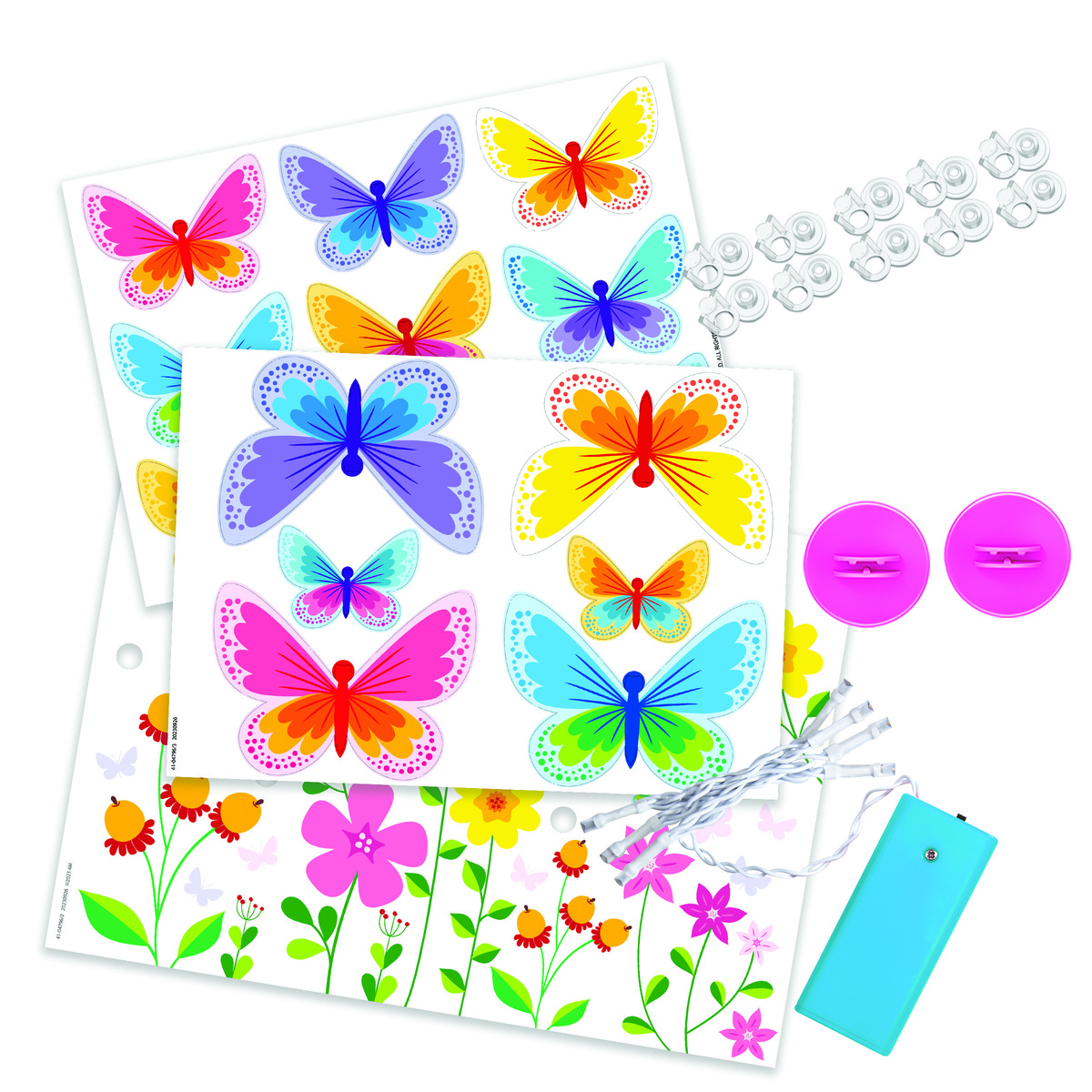 ΠΕΡΙΕΧΟΜΕΝΑ: 2 πεταλούδες πρότυπα, 1 ταμπλό, 1 γιρλάντα με 9 φωτάκια, 1 κάλυμμα θήκης μπαταρίας με βίδα, 9 αντάπτορες και πείροι, 2 βάσεις, αφρώδες υλικό που κολλάει. Επίσης, απαιτούνται, αλλά δεν περιλαμβάνονται στη συσκευασία: 2 μπαταρίες 1,5V AA, ένα μικρό σταυροκατσάβιδο.