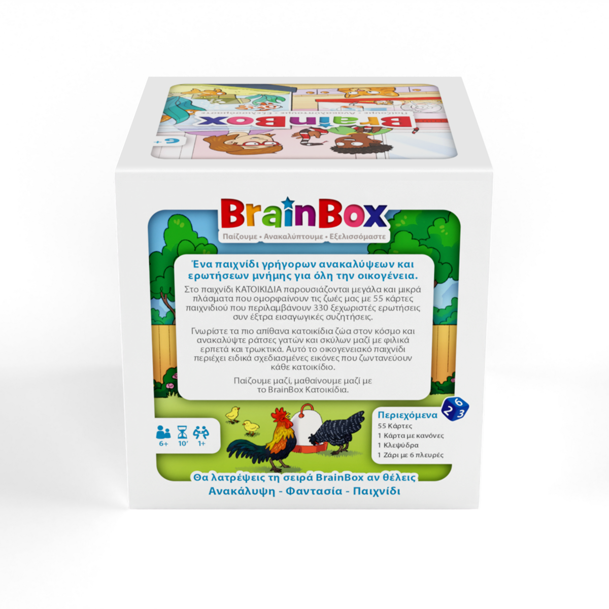 Ανακάλυψε τα πιο απίθανα κατοικίδια ζώα στον κόσμο με το BrainBox Κατοικίδια! Από ράτσες γατών και σκύλων μέχρι συναρπαστικά είδη φιλικών ερπετών και ψαριών, το οικογενειακό αυτό παιχνίδι είναι εδώ για να διασκεδάσει μικρούς και μεγάλους. Διάλεξε μια κάρτα μέσα από το BrainBox. Αναποδογύρισε την κλεψύδρα και προσπάθησε να τη μάθεις απ' έξω σε 10 δευτερόλεπτα! Τώρα ρίξε το ζάρι και απάντησε στην αντίστοιχη ερώτηση. Αν απαντήσεις σωστά κρατάς την κάρτα, αν απαντήσεις λάθος βάζεις την κάρτα πάλι μέσα στο BrainBox.