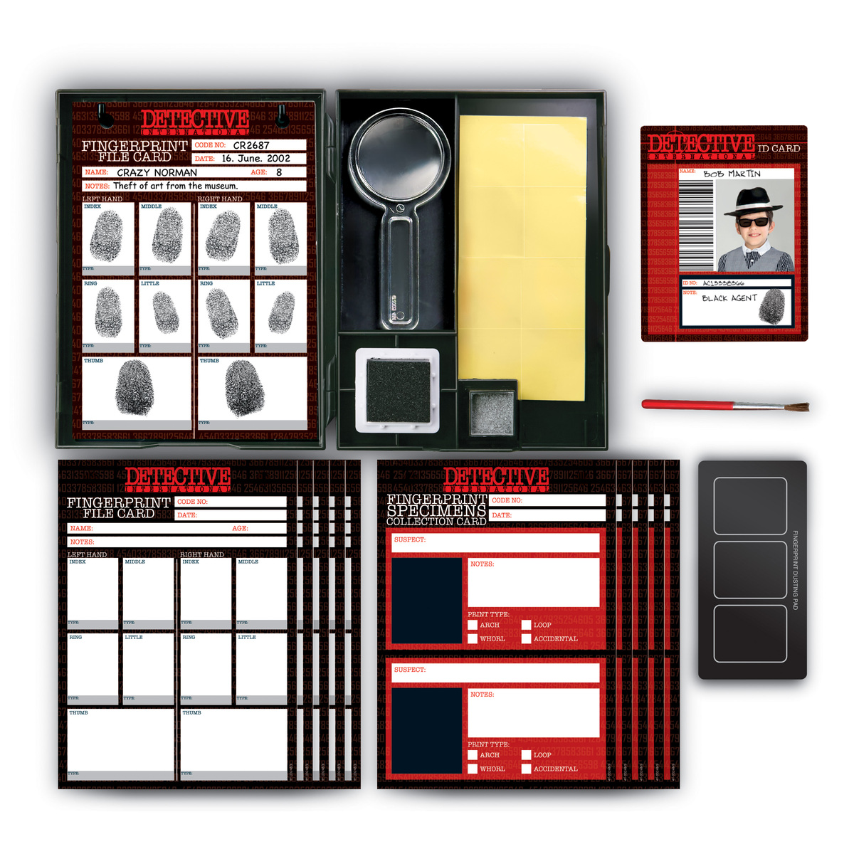 ΠΕΡΙΕΧΟΜΕΝΑ: επάνω μέρος θήκης, κάτω μέρος θήκης, επάνω μέρος δακτυλίου εστίασης, κάτω μέρος δακτυλίου εστίασης, κάλυμμα θήκης μπαταριών με βίδα, υποδοχή LED, κυρτοί φακοί x 2, καπάκια ακροδεκτών x 2, βίδες x 10, στήριγμα, διαφάνειες χαρακτηριστικών προσώπου, κάρτα στήριξης διαφανειών, πρακτική πλαστική θήκη για αποθήκευση όλων των εξαρτημάτων, ταμπόν μελανιού, δοχείο σκόνης ανίχνευσης αποτυπωμάτων, μεγεθυντικός φακός, πινέλο, σετ καρτών αρχείου δακτυλικών αποτυπωμάτων, σετ καρτών συλλογής δακτυλικών αποτυπωμάτων, ταυτότητα ντετέκτιβ, σετ διάφανων ταινιών, ταμπόν για συλλογή και εμφάνιση λανθανόντων δακτυλικώναποτυπωμάτων. Επίσης, απαιτούνται, αλλά δεν περιλαμβάνονται στη συσκευασία: 3 μπαταρίες 1,5V ΑΑΑ, ένα μικρό σταυροκατσάβιδο.