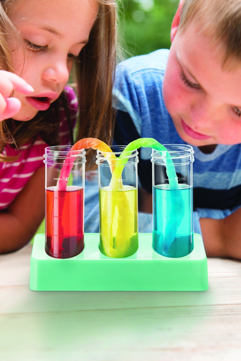 ΠΕΡΙΕΧΟΜΕΝΑ: δοκιμαστικοί σωλήνες x 3, φιάλες με σταγονόμετρο x 3, δίσκος ανάμειξης χρωμάτων, σταγονόμετρο, κουτάλι ανάδευσης, στατώ δοκιμαστικών σωλήνων, ταμπλέτες χρωστικών τροφίμων x 3, χαρτί υγείας, κάρτα χρωματιστών μοτίβων, πρότυπα από φύλλο αλουμινίου (ηφαίστειο "A", τέρας "B", πτερύγιο "C"), μπουκάλι, πλαίσιο αυτοκινήτου με 4 τροχούς, στήριγμα δοκιμαστικού σωλήνα, δοχείο, πηδάλιο, χαρτί pH, σωλήνας με εύκαμπτες συνδέσεις, βιδωτό καπάκι, κολλητική πάστα, μπαλόνι, θάλαμος με βιδωτό καπάκι, αλουμινόχαρτο. Επίσης, απαιτούνται, αλλά δεν περιλαμβάνονται (διαθέσιμα στην κουζίνα): ξύδι, μαγειρικό λάδι, νερό, υγρό απορρυπαντικό πιάτων, μαγειρική σόδα, γάλα, συρραπτικό, χωνί, πιάτο, μέλι, πάγος, γκλίτερ, πλαστικές χάντρες, κουτάλι της σούπας, σταφίδες, πιπέρι, καλαμπόκι για ποπ κορν, μεταλλική βίδα, οδοντογλυφίδες