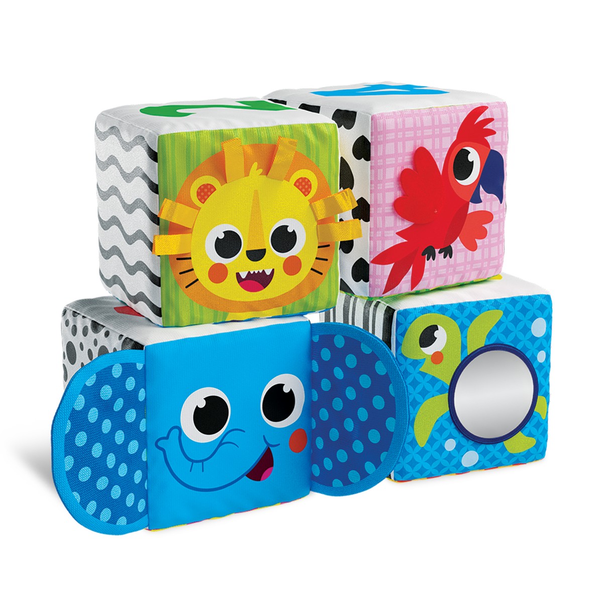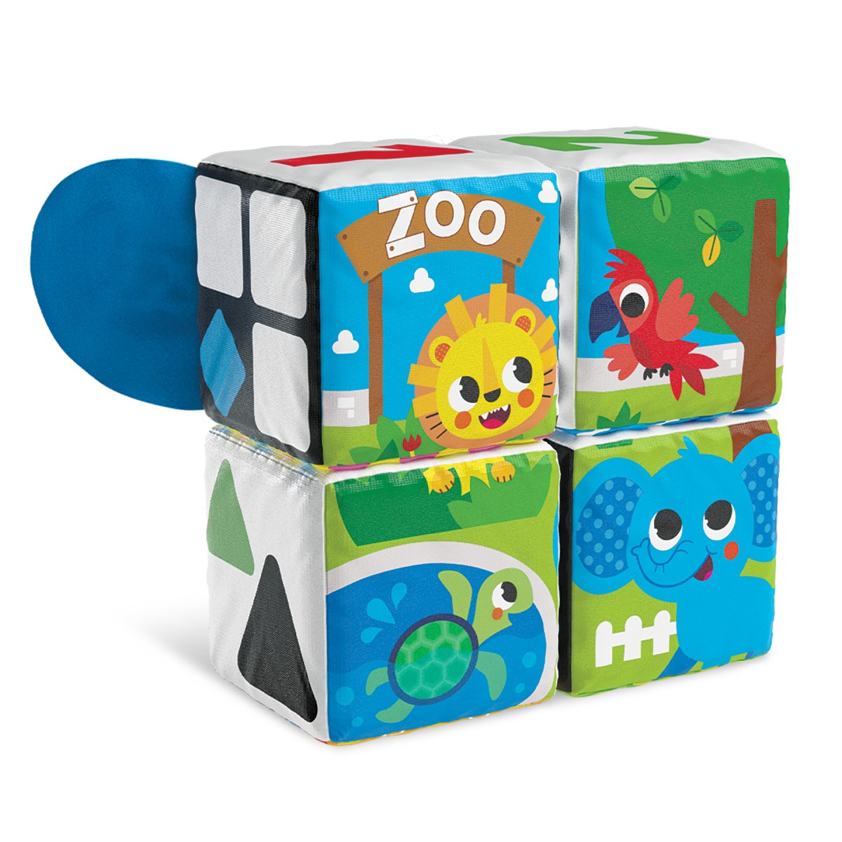 Οι Μαλακοί Κύβοι Ζωολογικός Κήπος θα ενθουσιάσουν όλους τους μικρούς φίλους! Οι κύβοι περιλαμβάνουν ευχάριστες στην αφή λεπτομέρειες, όπως καθρεφτάκι και κορδέλες, οι οποίες προσφέρουν ποικίλα αισθητηριακά ερεθίσματα. Κάθε πλευρά του κύβου περιλαμβάνει και μια διαφορετική πληροφορία. Τα μωρά μπορούν να φτιάξουν παζλ με τους κύβους συνδυάζοντάς τους κατάλληλα, να τους στοιβάξουν, να μάθουν αρίθμηση, χρώματα και σχήματα.