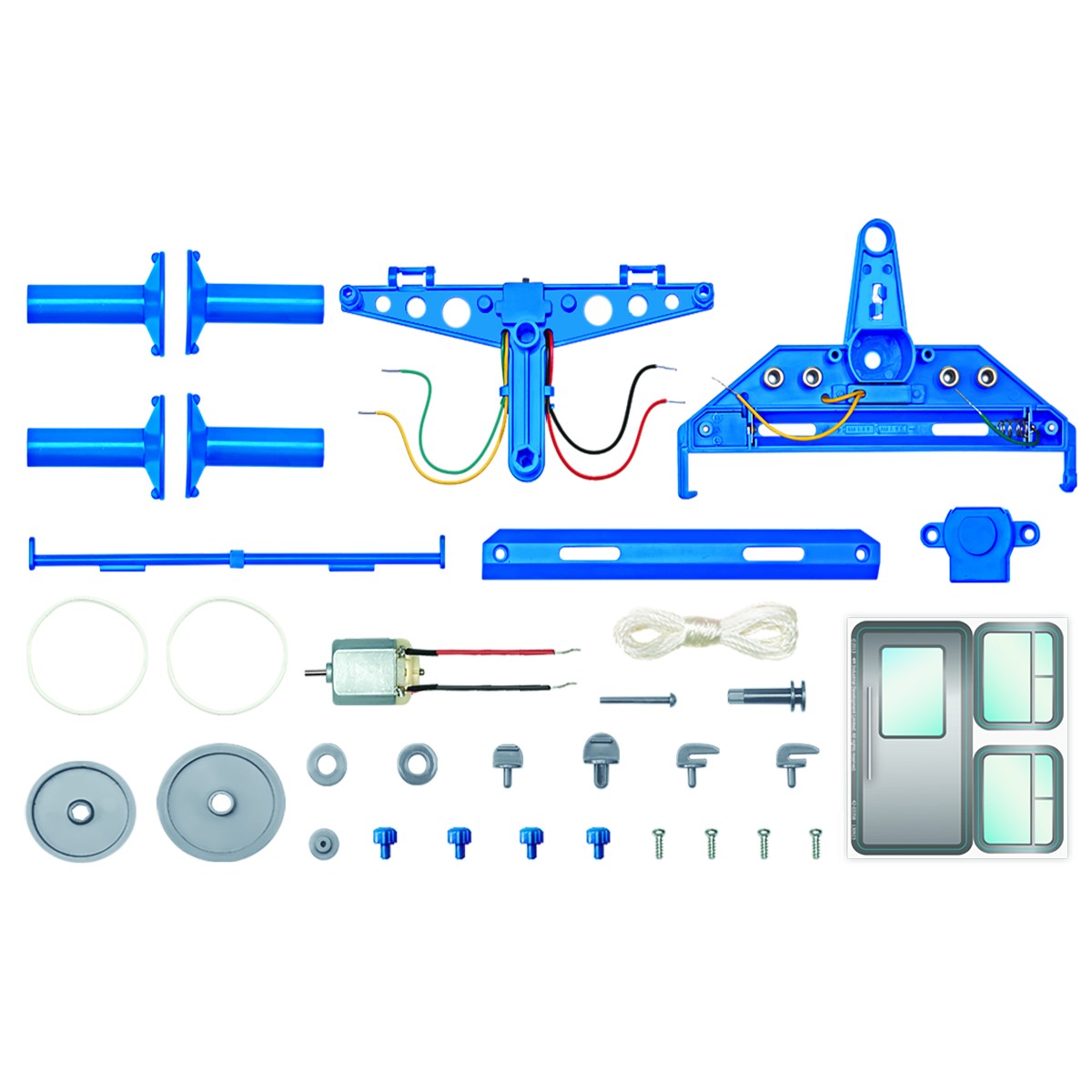 ΠΕΡΙΕΧΟΜΕΝΑ: Στήριγμα για ρόδες x1,Θήκη για μοτέρ x 1, Αυτοκόλλητο για κονσερβοκούτι x 1, Αντιστρεφόμενος άξονας x 1, Κάλυμμα μπαταρίας x1, Σπάγκος, Μεσαία τροχαλία x 1, Μεγάλη τροχαλία x 1, Σετ από μισά μέρη (στοπ) καλωδίου x2, Μοτέρ x 1, Κάλυμμα μοτέρ x1, Λαστιχάκι x 2, Μεγάλο εξάρτημα για μπλοκάρισμα τροχών x 1, Μεσαίος άξονας τροχών x 1, Περιστρεφόμενο εξάρτημα μπλοκαρίσματος x1, Τροχαλία για το μοτέρ x 1, Πλαϊνό εξάρτημα μπλοκαρίσματος τροχών x2, Καπάκι ακροδεκτών x 4, Άξονας για κονσερβοκούτι x1, Πλαϊνή ρόδα x2, Βίδα x 4.