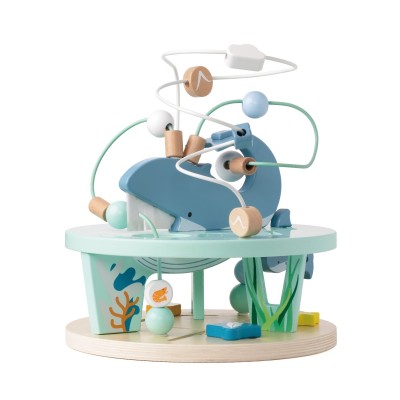 Αυτός ο υπέροχος Ξύλινος Λαβύρινθος αποτελεί έναν ιδανικό τρόπο για να προσεγγίσουν τα παιδιά τον μαγικό κόσμο της ζωής στους ωκεανούς. Τα παιδιά μπορούν να μετακινούν τις πολύχρωμες στρογγυλές χάντρες με διάφορα σχέδια γύρω από τη φάλαινα, πάνω και κάτω από τη θάλασσα, ακολουθώντας το μικρό φαλαινάκι καθώς κολυμπά γύρω από τη μαμά του και περνά ανάμεσα από φύκια, ψάρια και άλλα θαλάσσια στοιχεία. Το παιχνίδι βοηθά στην ανάπτυξη της λεπτής κινητικότητας, του συντονισμού χεριού-ματιού και της ικανότητας επίλυσης προβλημάτων, προσφέροντας ταυτόχρονα ώρες δημιουργικής και διασκεδαστικής απασχόλησης.