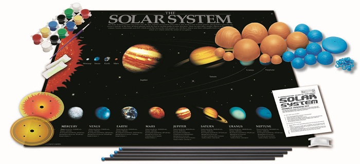 Περιεχόμενα: Βέργες μήκους 40 εκ. x 4,γάτζοι ύψους 1,5 εκ. x 15, βέργες μήκους 1 εκ. x17, ημισφαίρια πλανητών διαφόρων μεγεθών x10, ηλιακός δαχτύλιος διαμέτρου 7 εκ., δαχτύλιος του Κρόνου διαμέτρου 11,5 εκ., κεντρική δομή διαμέτρου 7 εκ., νήμα για το κρέμασμα.