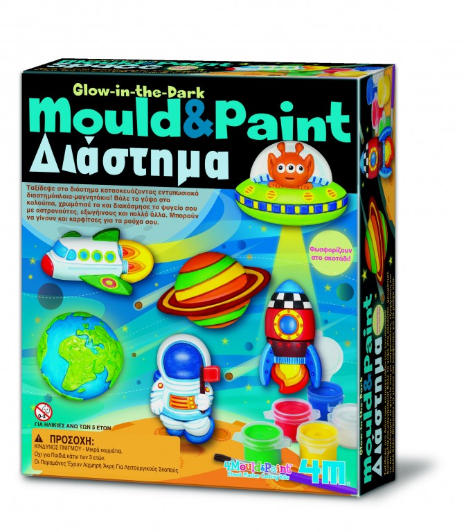 ΠΑΡΑΣΚΕΥΗ: Προετοίμασε το μείγμα του γύψου, ακολουθώντας πιστά τις οδηγίες όπως αναγράφονται στη συσκευασία. Ρίξε το μείγμα του γύψου στα καλούπια και ανακίνησε τα ελαφρά. Άφησε τον γύψο να στερεοποιηθεί για λίγη ώρα και ζωγράφισε τις διαστημικές φιγούρες με τα χρώματα που περιλαμβάνονται.
